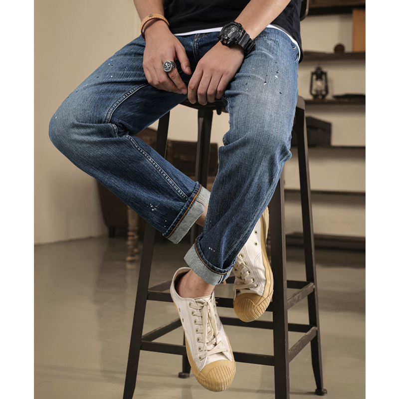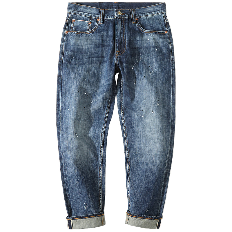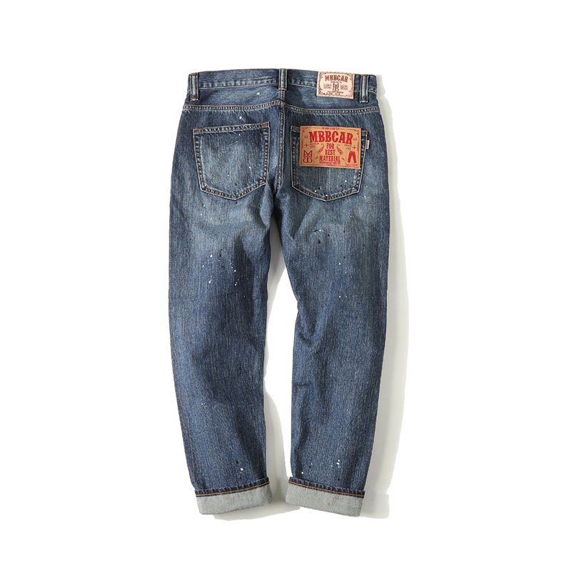 Narrow 14OZ splashing ink process washing heavy red ear denim nine-point pants MBBCAR washed men's jeans