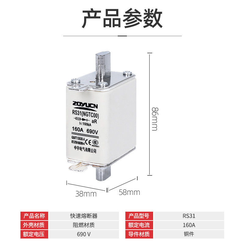 Zhongyu NGTC00 RS31 160A 690V melting core fast plug-in fuse ceramic fuse melting core