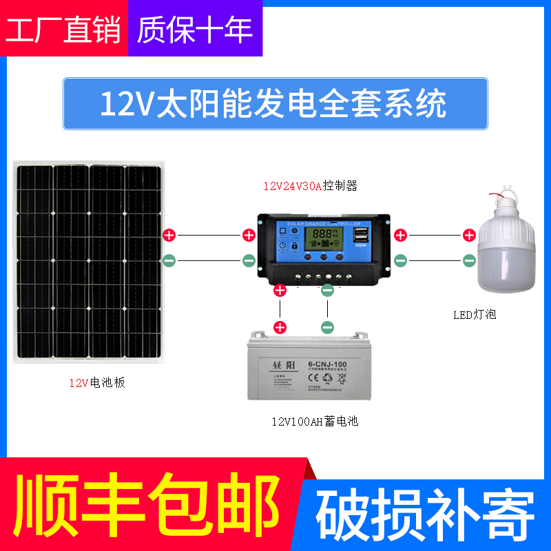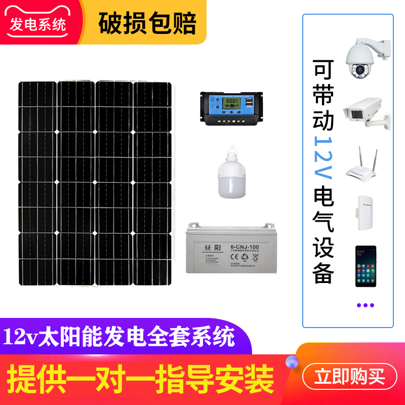 Full set of monocrystalline 100w solar photovoltaic power generation panel 12v battery panel Household monitoring stall power supply system
