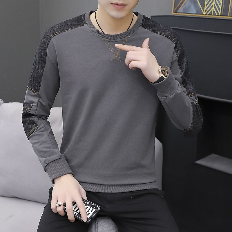 Long-sleeved T-shirt men's spring, autumn and winter new color matching Korean version of the tide brand trend loose round neck plus velvet base men's thick T-shirt