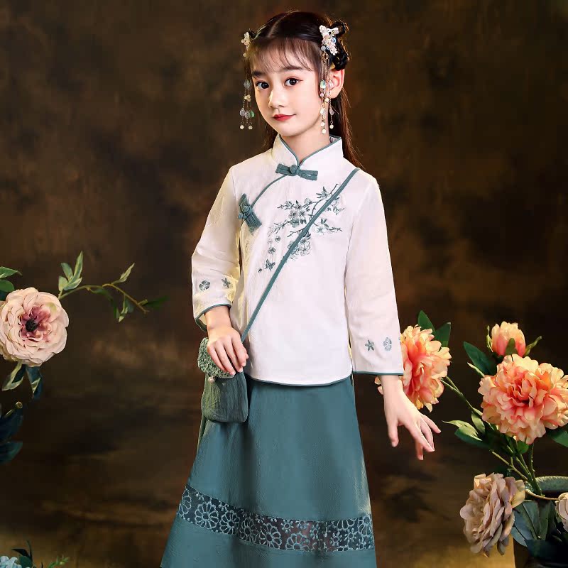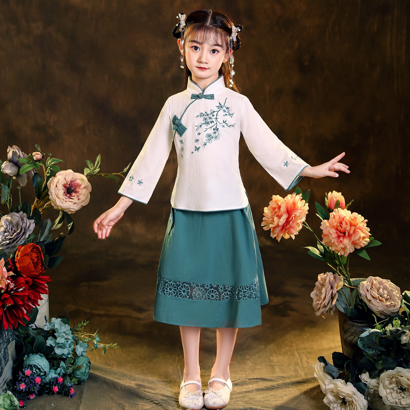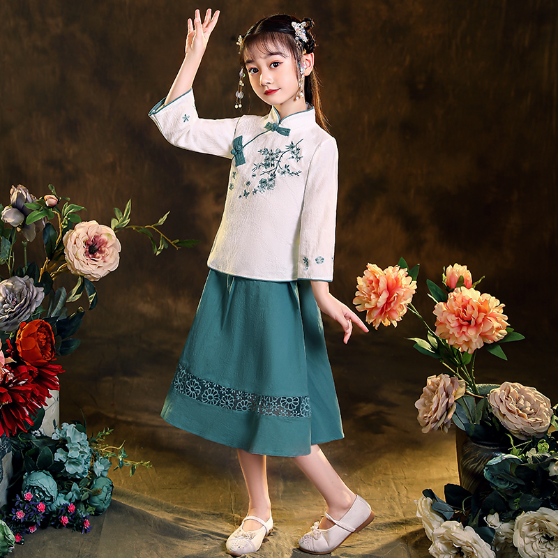 Hanfu Girl Chinese Style Cotton and Hemp Children's Tang Dress Two-Piece Long Sleeve Little Girl Republic of China Style Princess Ancient Dress Autumn Dress