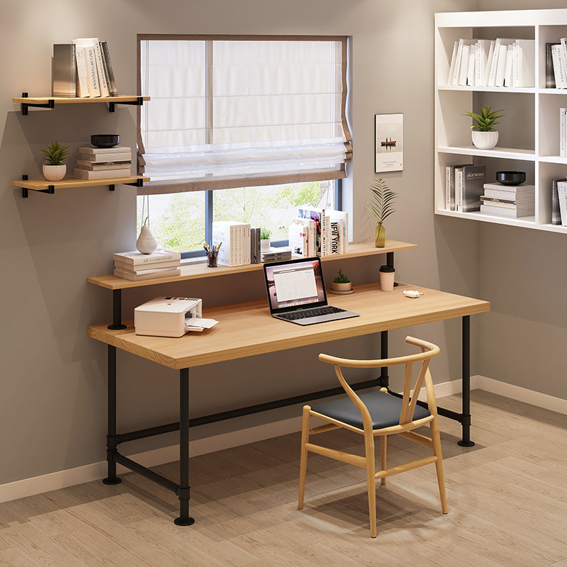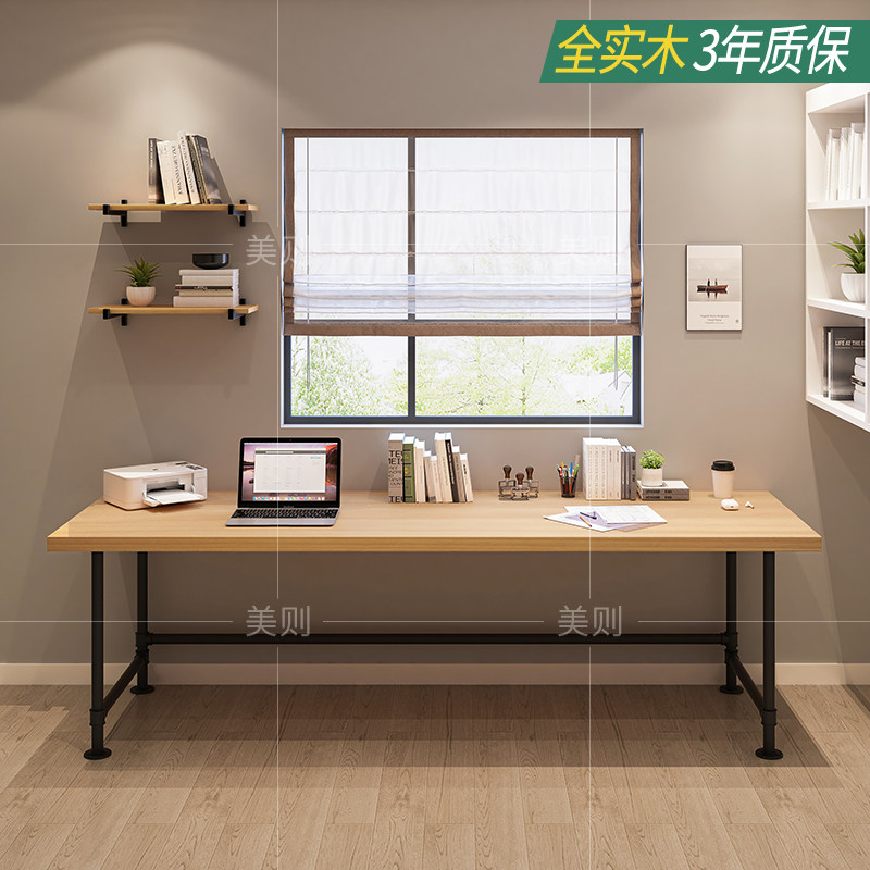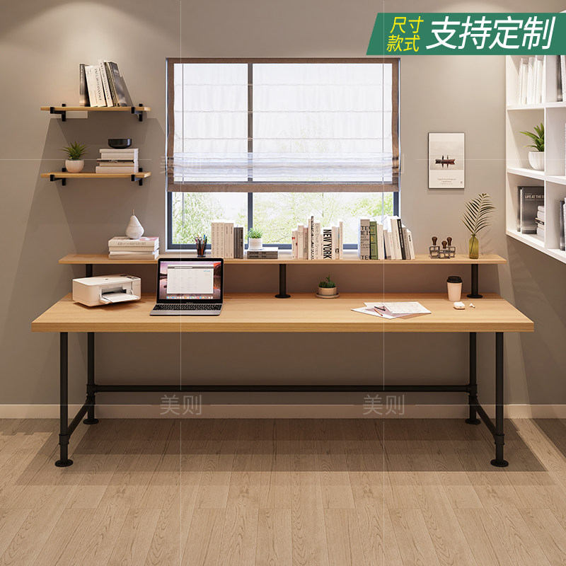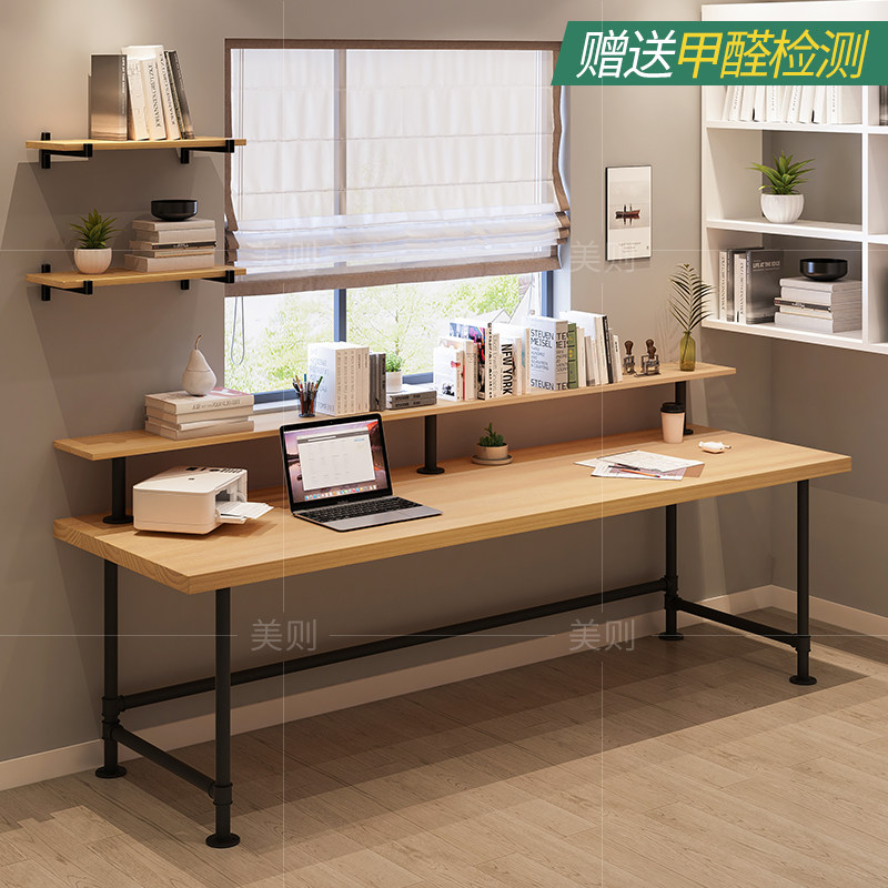 loft solid wood double writing table with bookshelves leaning against wall duo long desk bookshelf American big computer desk study table-Taobao