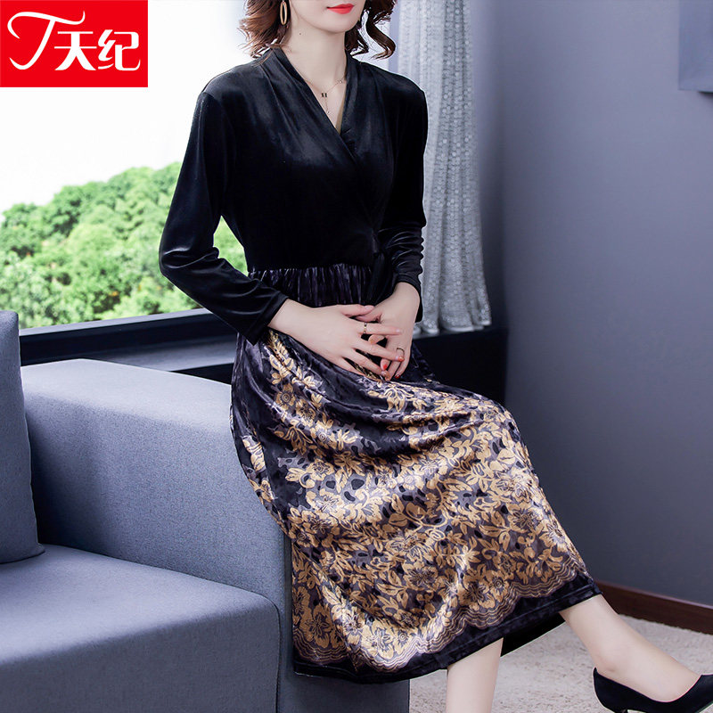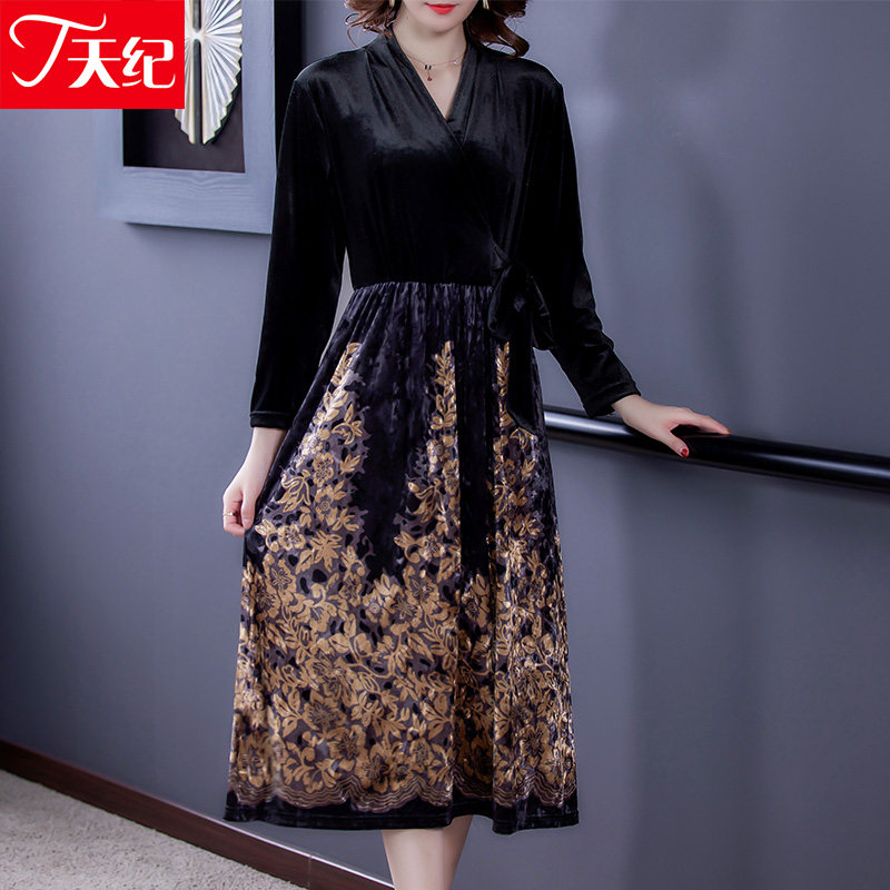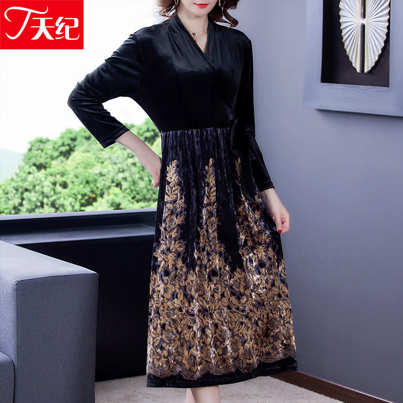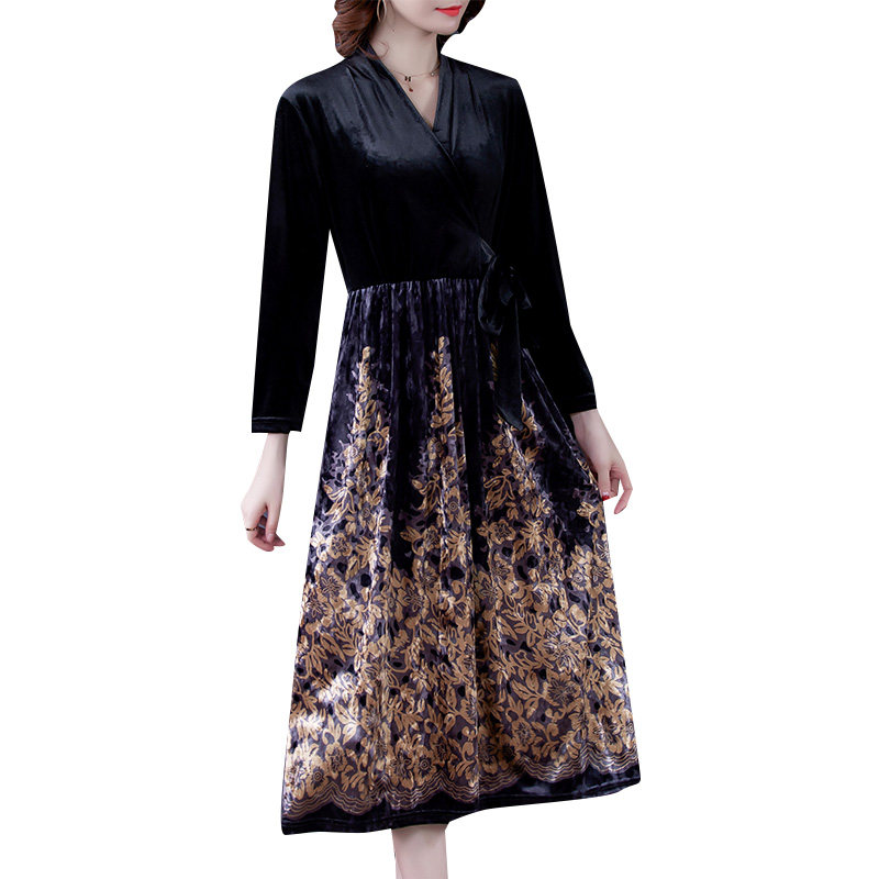 Golden Velvet Dress Noble Foreign Pie 2022 Spring Dress New Lady Popular lady Temperament Over Knee-down Skirt