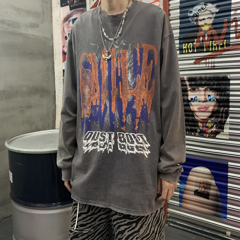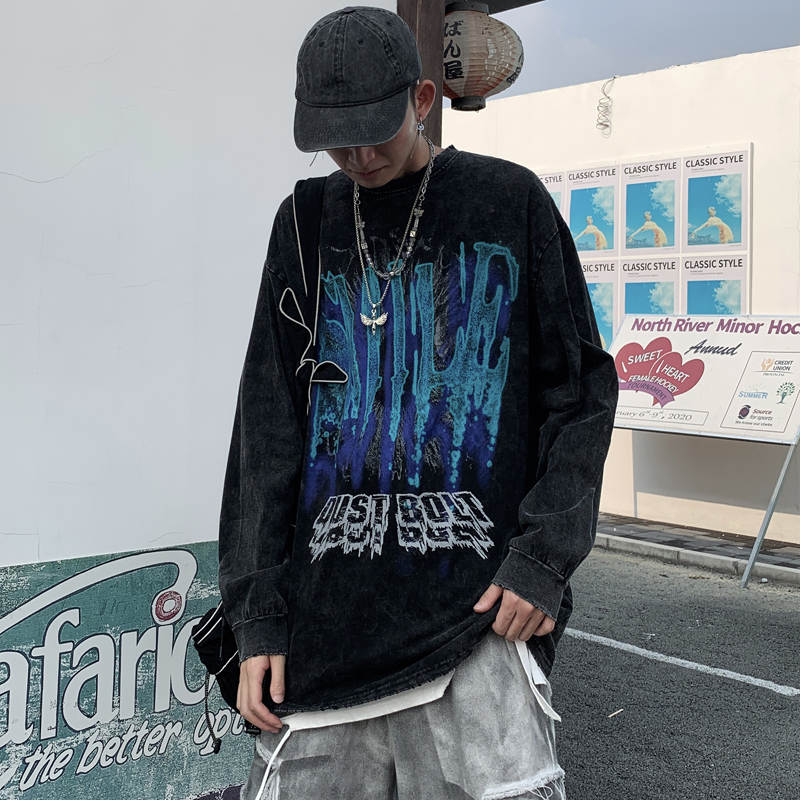 Shampoo wool side Guochao Long sleeves T-shirt Male Street Loose Tide Cards Autumn Clothing Hip Hop Trend Printed Undershirt Blouse