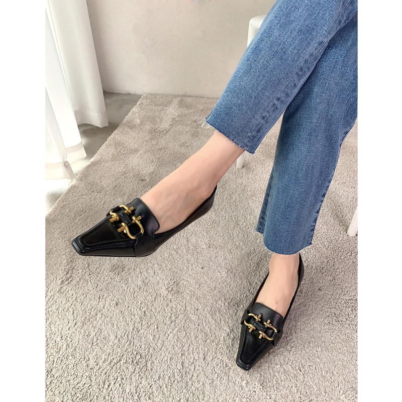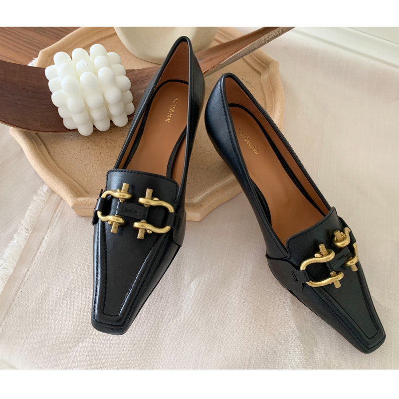 Ma's Jiamin Autumn Winter New Pine Fashion retro small square head genuine leather bag Shoe metal buckle with fine heel women's shoes