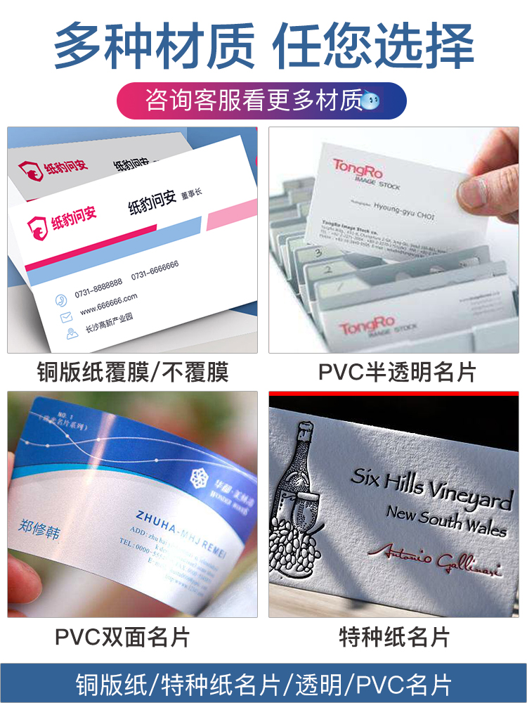 Coated paper laminated business card (thickened version) Coated paper non-laminated business card (thickened version) PVC material business card Please contact customer service Special paper business card Please contact customer service