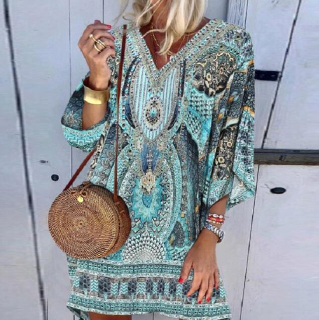Womens Autumn Bohemian V-neck Long Sleeve Print Dress