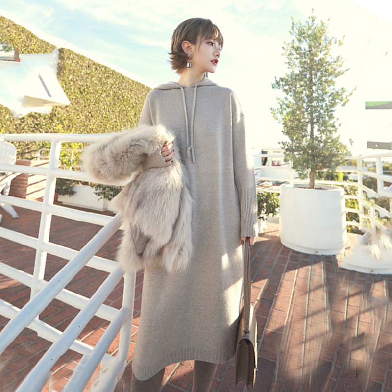 Skirt with coat women's autumn and winter knee-length sweater skirt hooded long sweater knitted bottoming dress