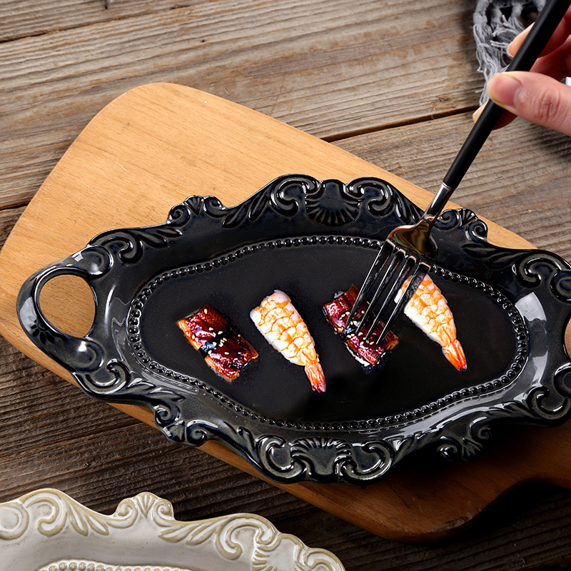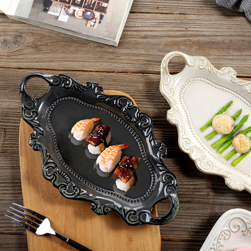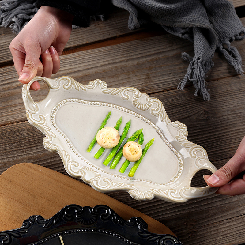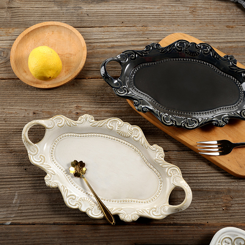 European style retro relief double ear plate creative plate Western plate fish plate fish plate household fruit plate snack plate ceramic tableware