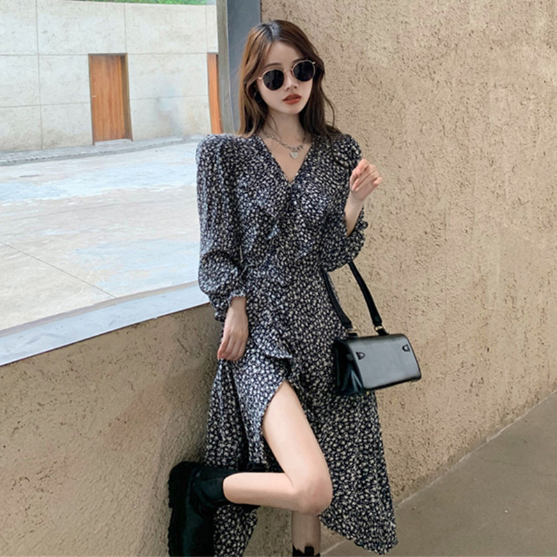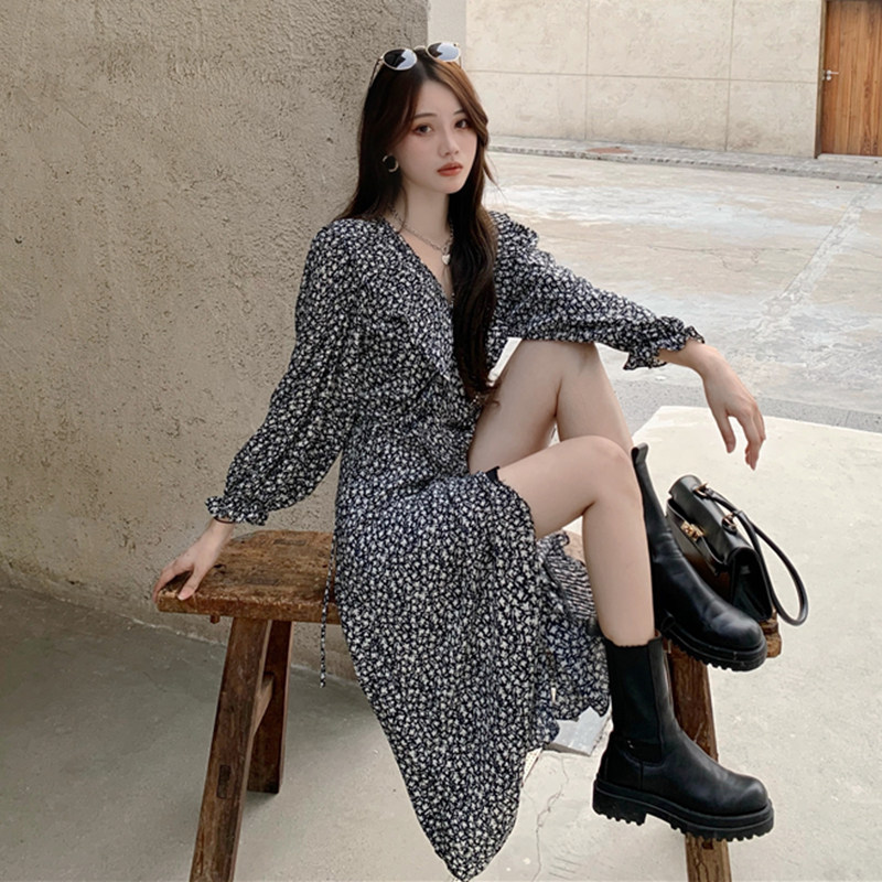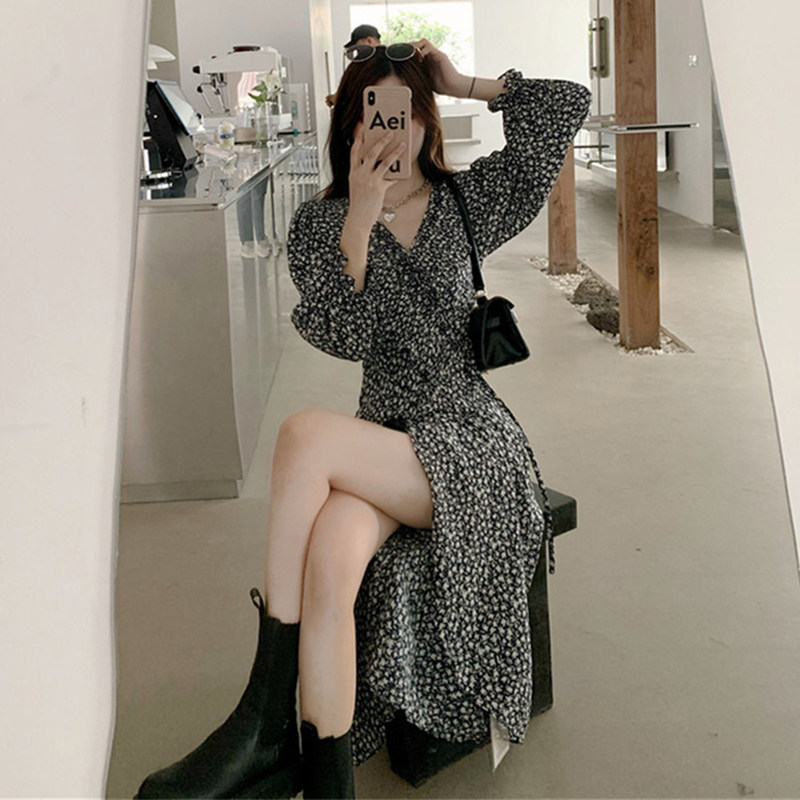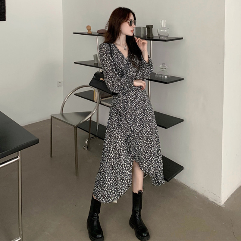 French design sense small fairy long version tea break light luxury light mature gentle wind flower long sleeve dress autumn