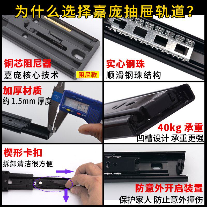 Brand damping buffer drawer track slide Three-section rail guide rail overall cabinet self-priming silent black electrophoretic steel slide new