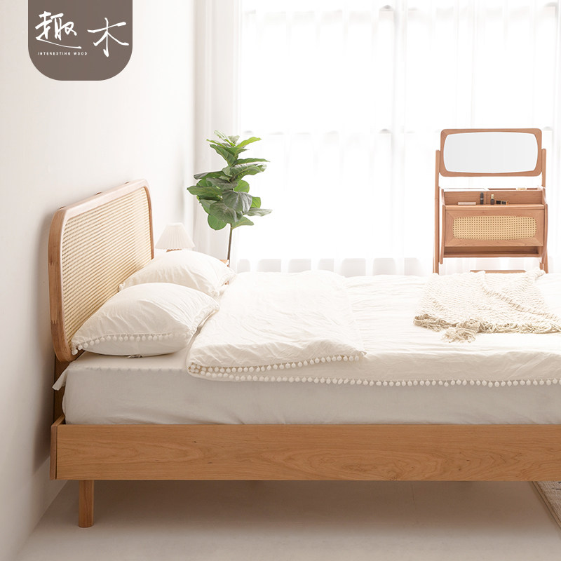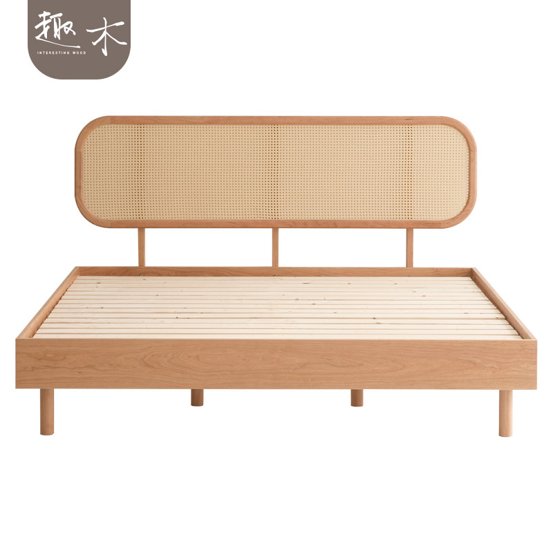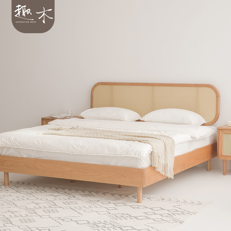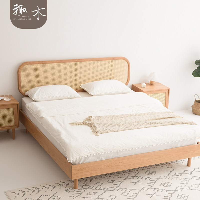 Nordic Retro Cherry Wood Rattan Chic Bed Day Style Black Walnuts Wood Light Lavish Art 1 8 Double Wedding Bed Eco-friendly Furniture