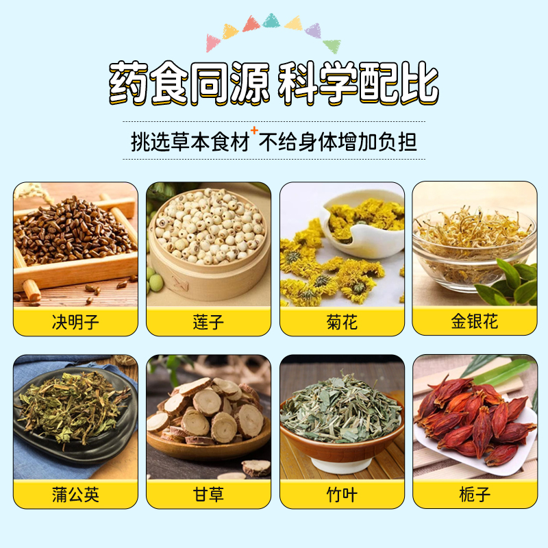 Chrysanthemum, honeysuckle, dandelion, bamboo leaves, gardenia, cassia, lotus seeds, etc.