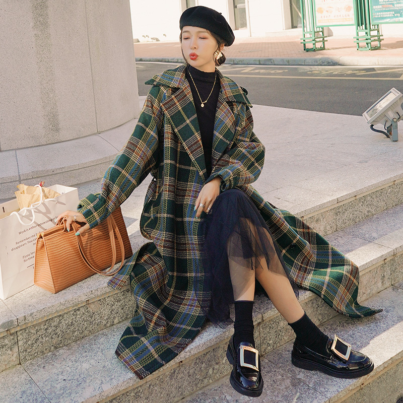 French retro plaid woolen coat women's winter 2022 new mid-length version over the knee temperament goddess fan woolen coat