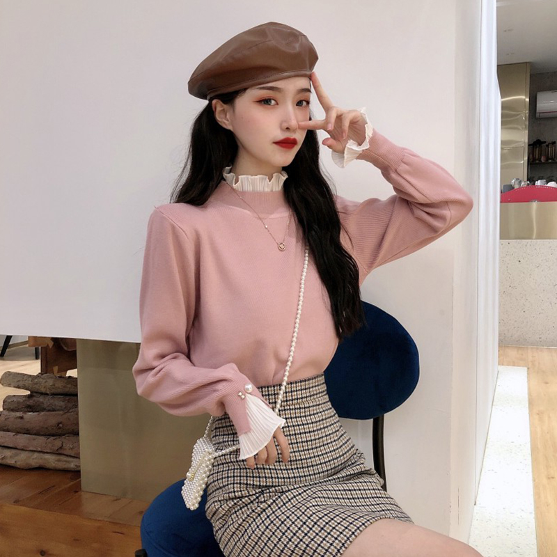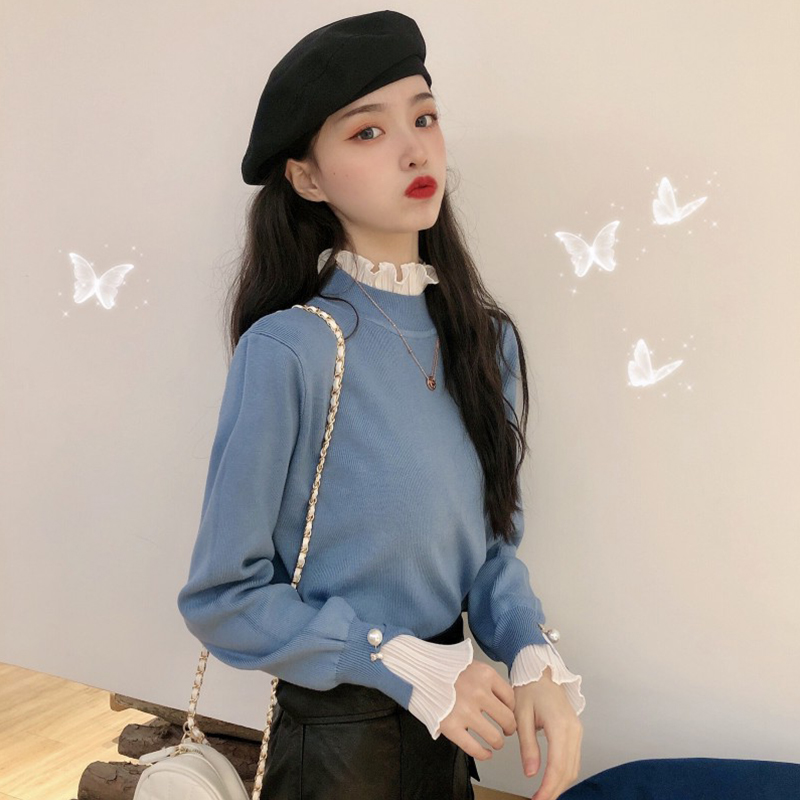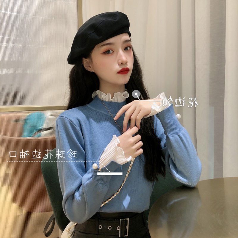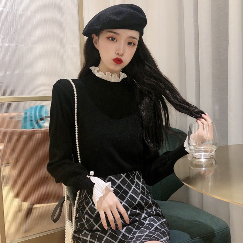 2022 autumn and winter new ruffled stitching black top women's slim fit half turtleneck warm knitted bottoming shirt