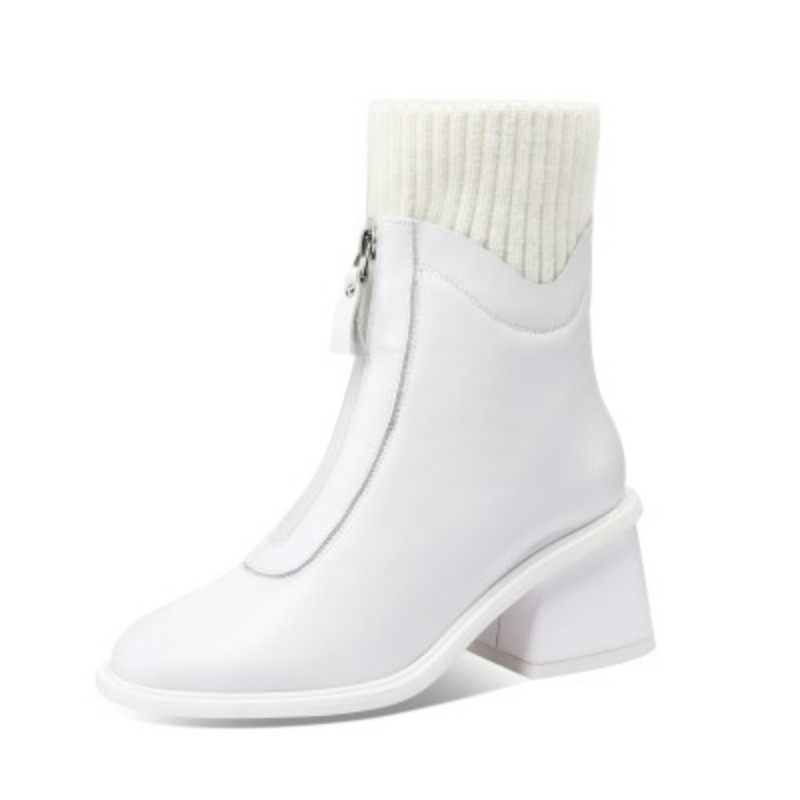 White boots Women's thick heel front zipper Martin boots high heel fashion boots autumn and winter single boots leather plus velvet wool boots