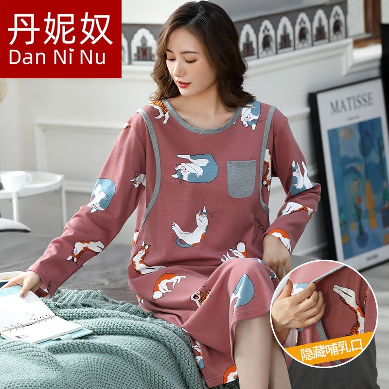 Lunar Subsuit Pure cotton pregnant woman Sleeping Woman Postnatal Invisible Breastfeeding spring autumn long sleeves large size Sleeping Skirt woman