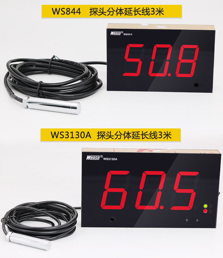 844 without alarm 3130 without alarm 1803A with alarm 1803B noise temperature and humidity integrated 844 external probe cable 3 meters 3130 external probe line 3 meters 1803A external probe line 3 meters (1803 models can be customized battery model) (battery and external probe models do not support return)