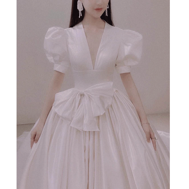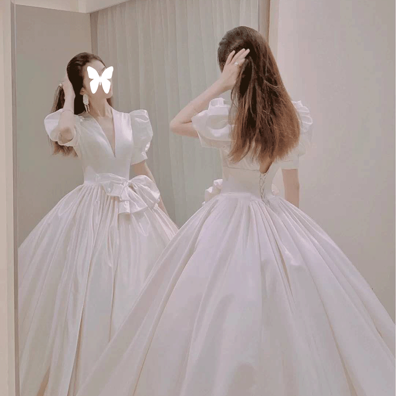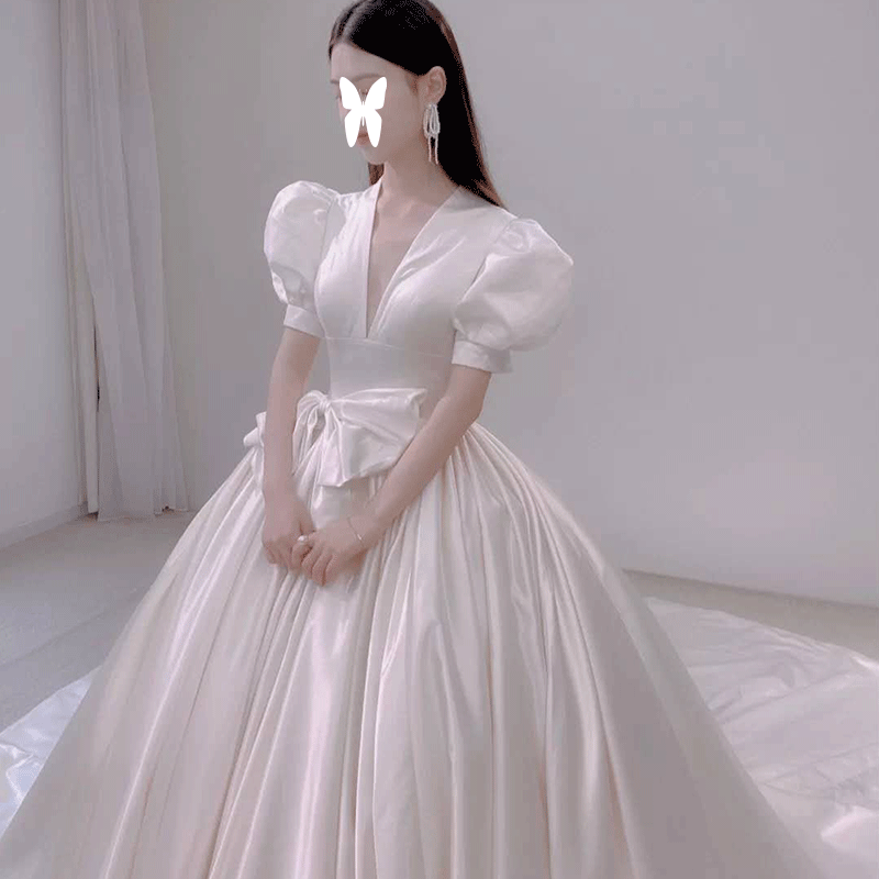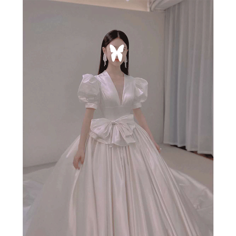 Satin main wedding dress 2021 new small temperament bride Mori simple Hepburn tail super fairy dream