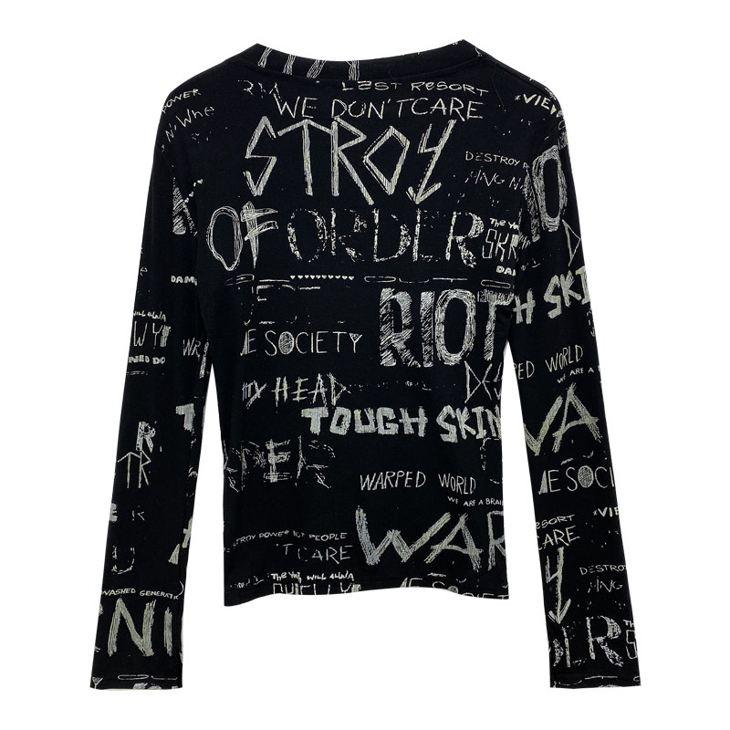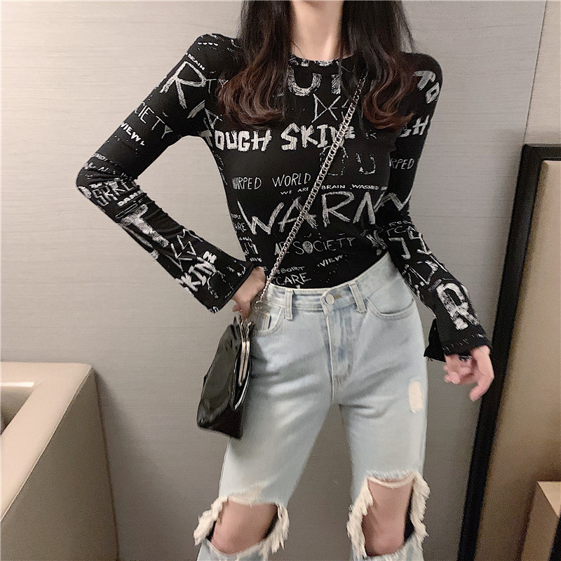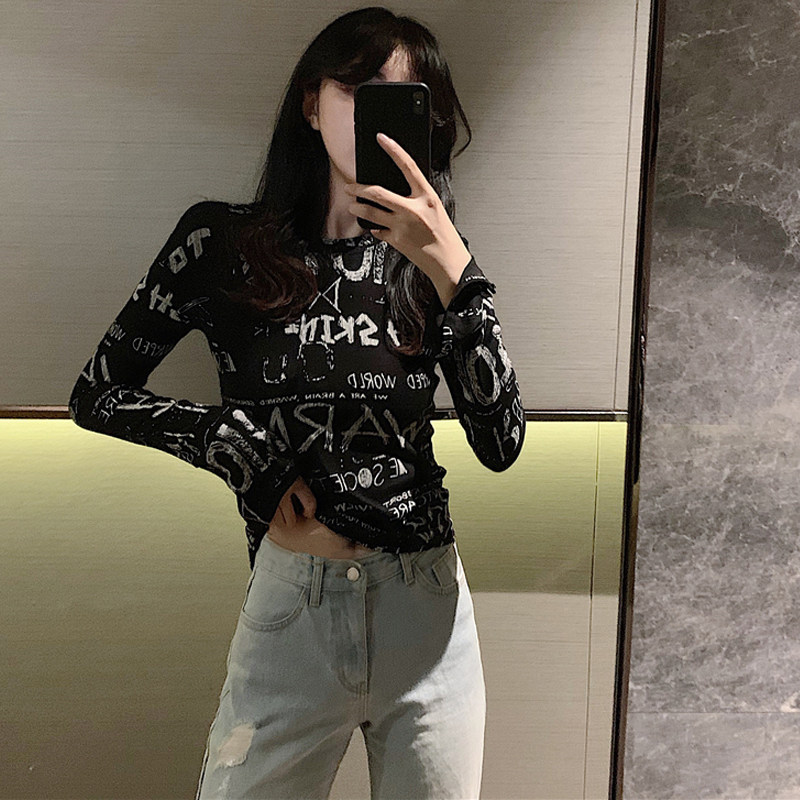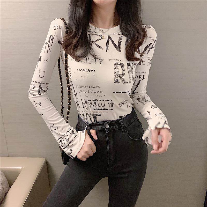South Korea's autumn 2020 new graffiti print slimming thin net red bottom shirt long-sleeved T-shirt women's ins trend