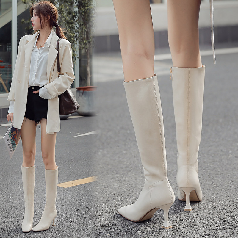 Boots women's 2022 new autumn and winter plus velvet large tube thick leg boots white leather but knee temperament boots