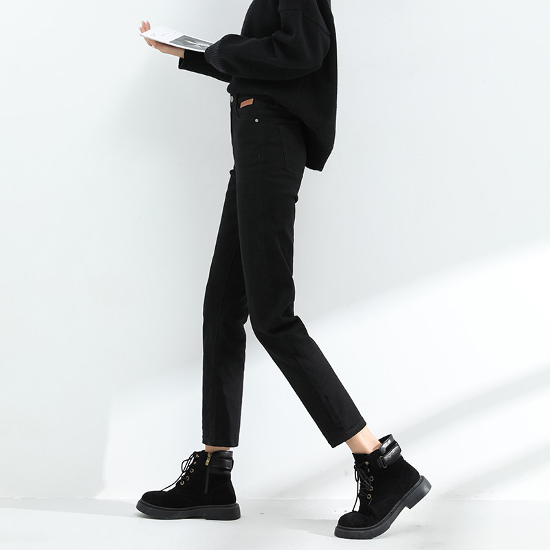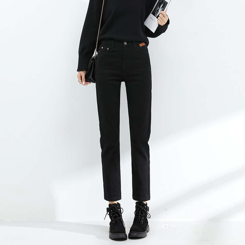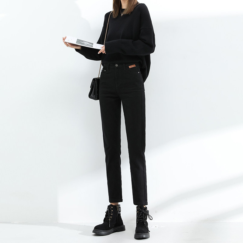Plush thickened black jeans women's straight loose autumn and winter look thin eighth pants trendy nine-pointer small cigarette pants - Taobao