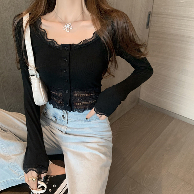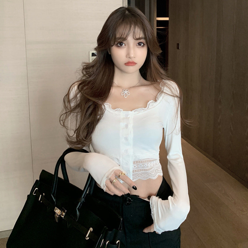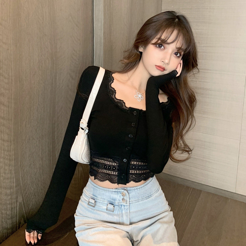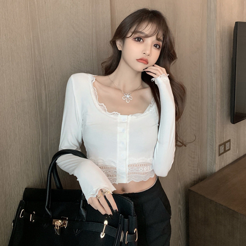 Lace stitching black base shirt Women's inner summer tight T-shirt sexy slim-fit short umbilical long-sleeved top