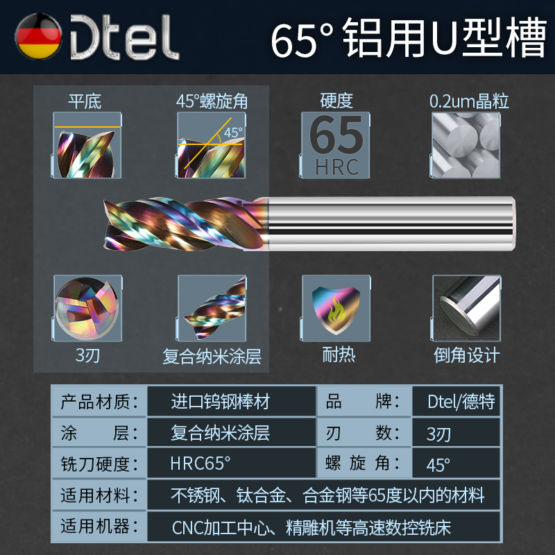 Dete aluminum with milling cutter 65 degrees u type groove 3-edge tungsten steel alloy large in to high efficiency open and coarse aluminium alloy special milling cutter