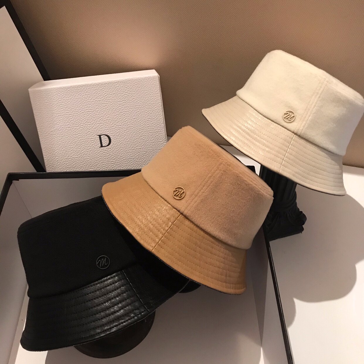 Japanese trendy woolen leather hat women's autumn and winter round face suitable for wild woolen stitching fisherman hat bucket hat