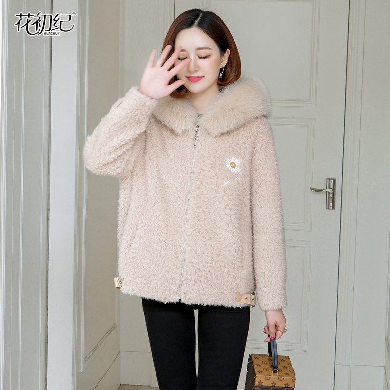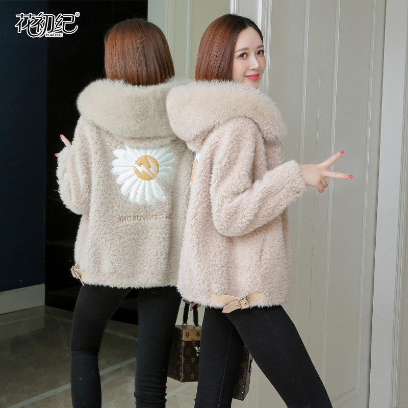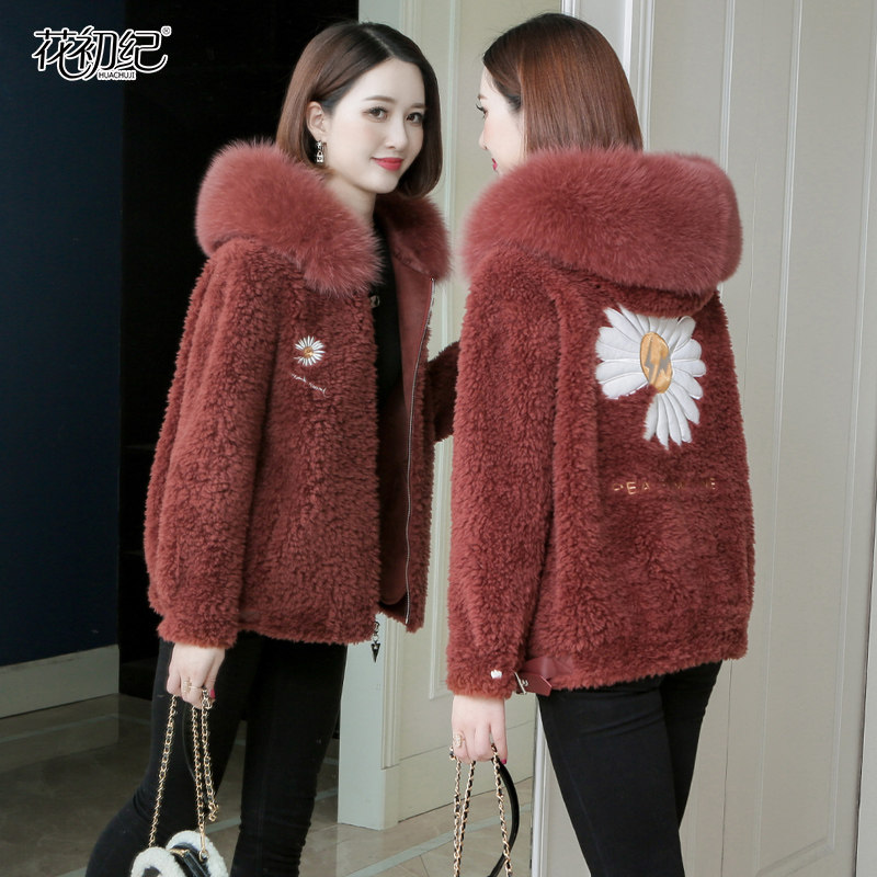 Granular sheep sheared coat women's short autumn and winter 2021 new fox fur hooded daisy embroidered fur coat