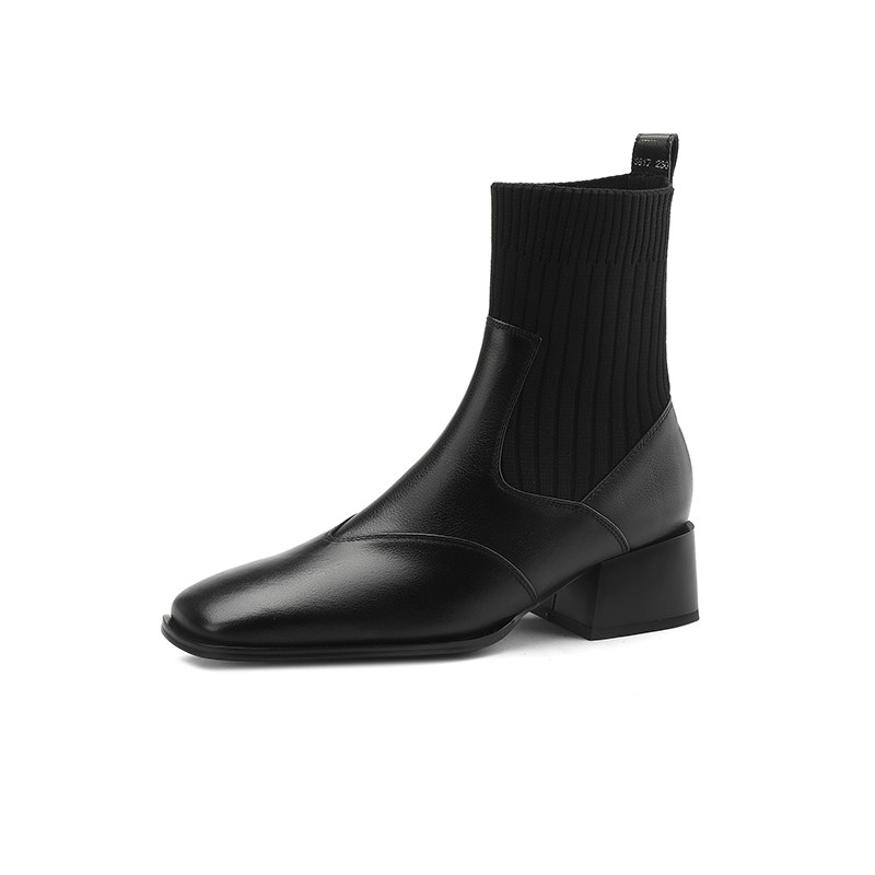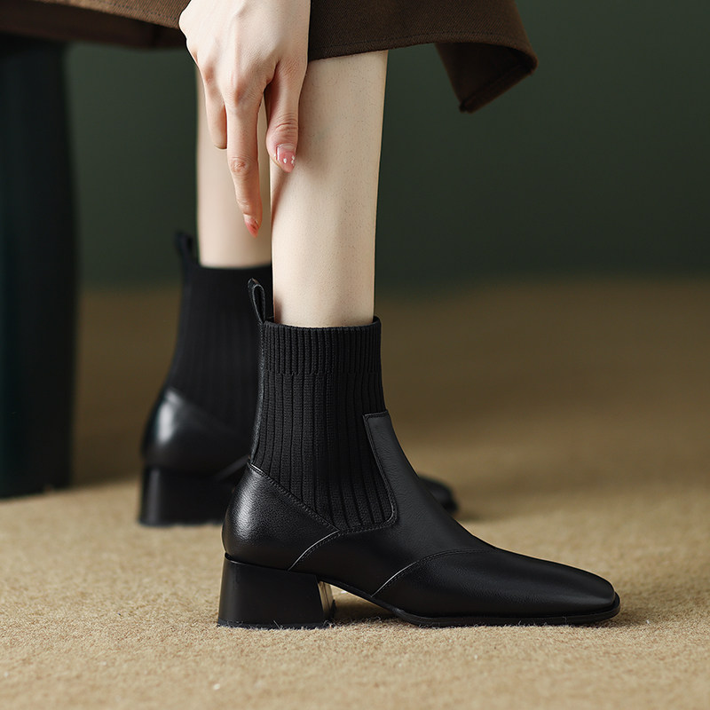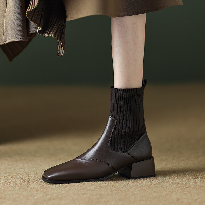 TATA DINGDANG She he dinges women shoes even socks boots women genuine leather apricot thick heel knit short boots Martin boots-Taobao