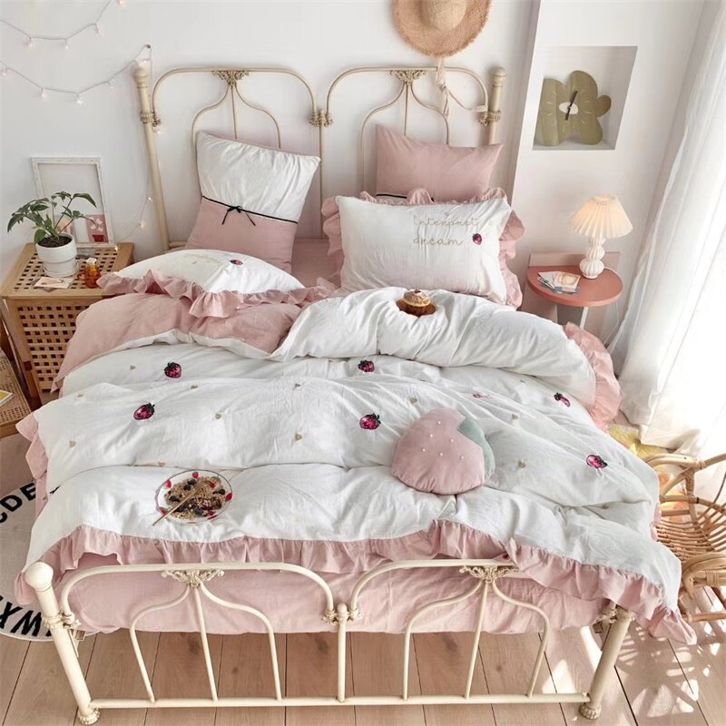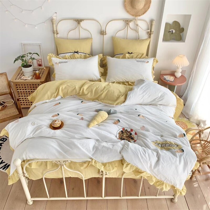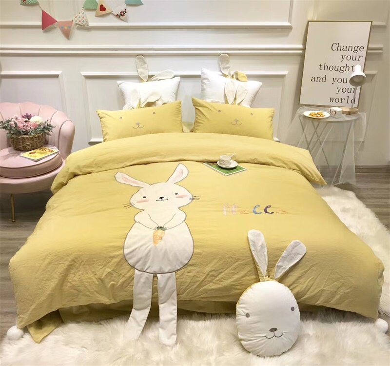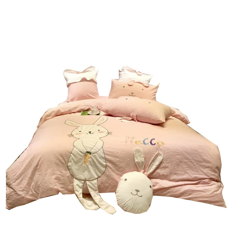 High-end all-cotton color weave washed cotton cartoon cute rabbit cloth appliqued embroidered four pieces cover bed sheet children kit