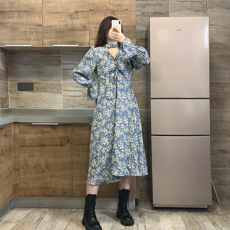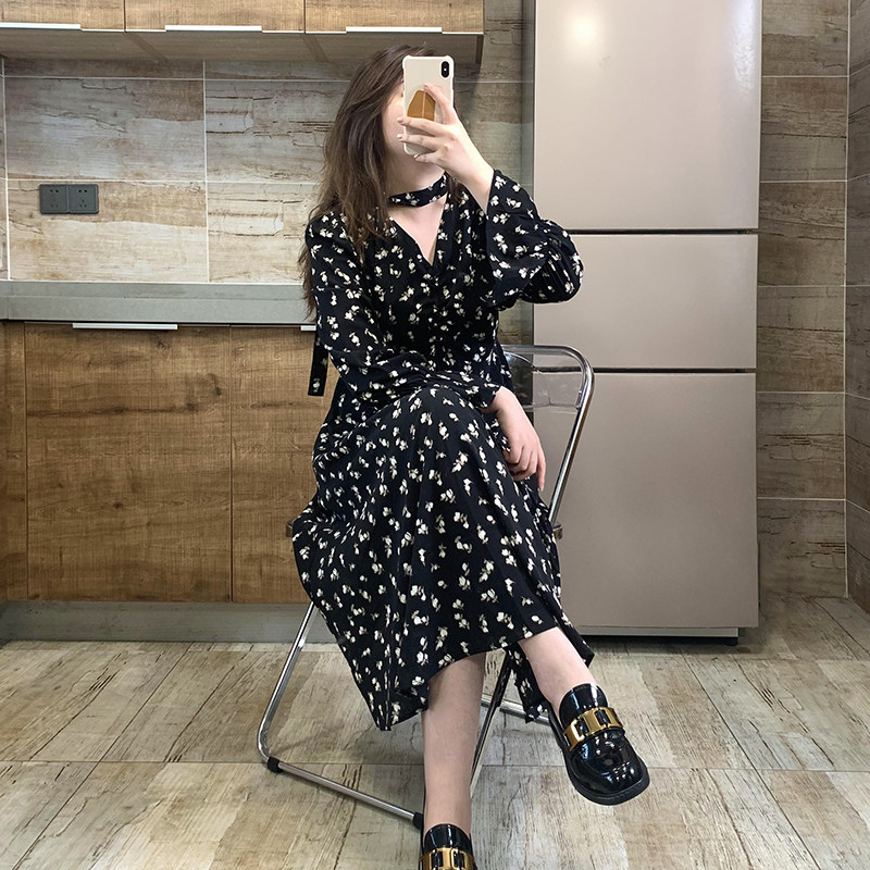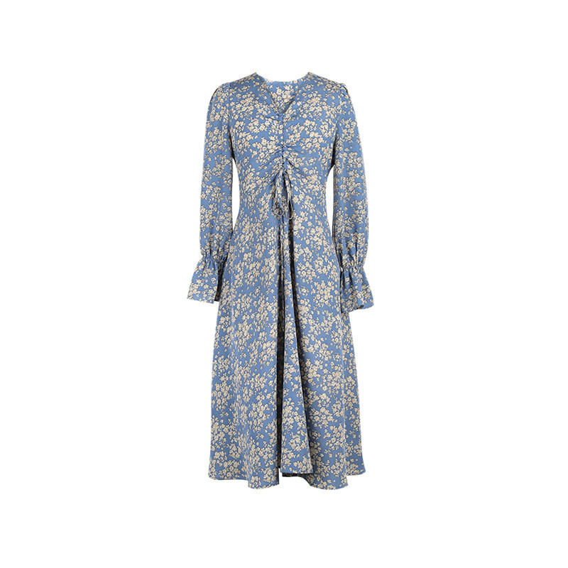 Julu Studio slightly fat custom floral temperament waist slim horn sleeve long version dress women