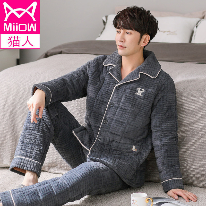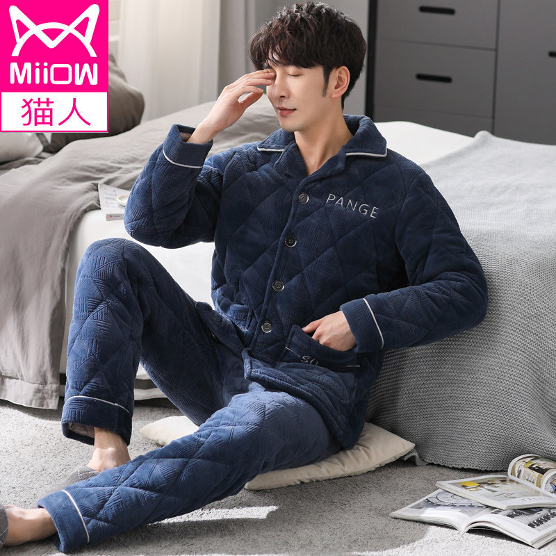Cat man pajamas autumn and winter thickened three-layer quilted plus velvet large size coral velvet green middle-aged winter homewear suit