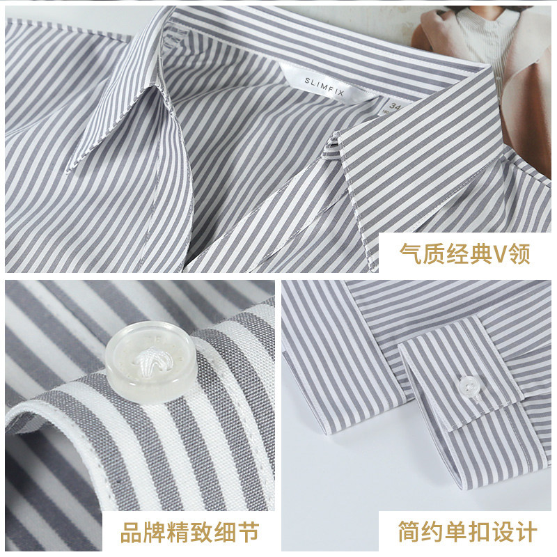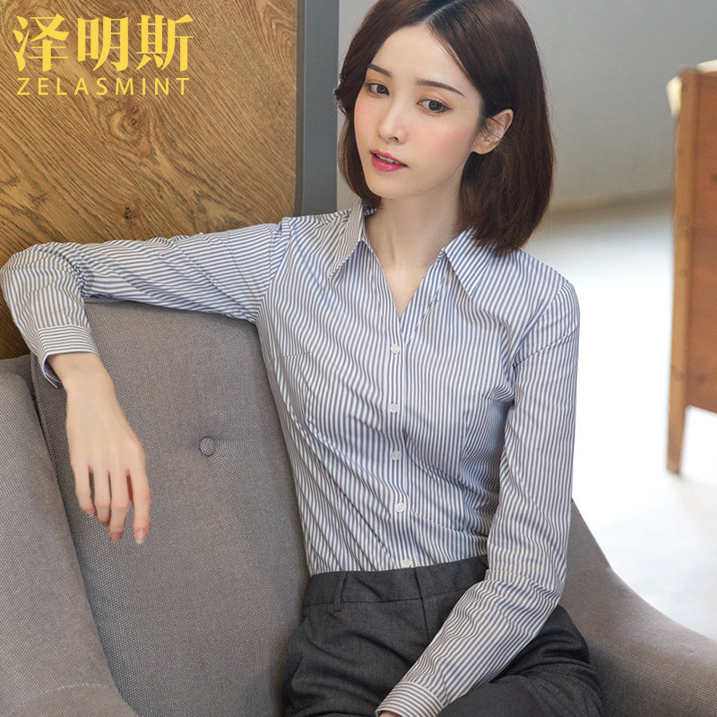 Zemings V-neck striped shirt women's long-sleeved autumn interview formal dress niche design blue temperament all-match shirt