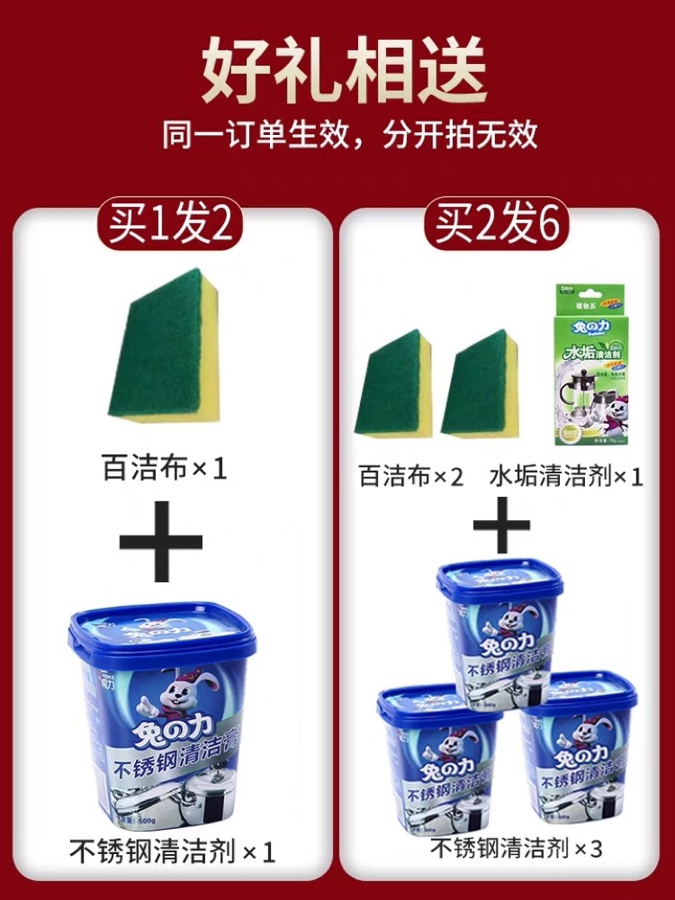 1 round 2 (100 scouring pads stainless steel cleaner) 2 rounds 6 100 scouring pads*2 stainless steel cleaner*3