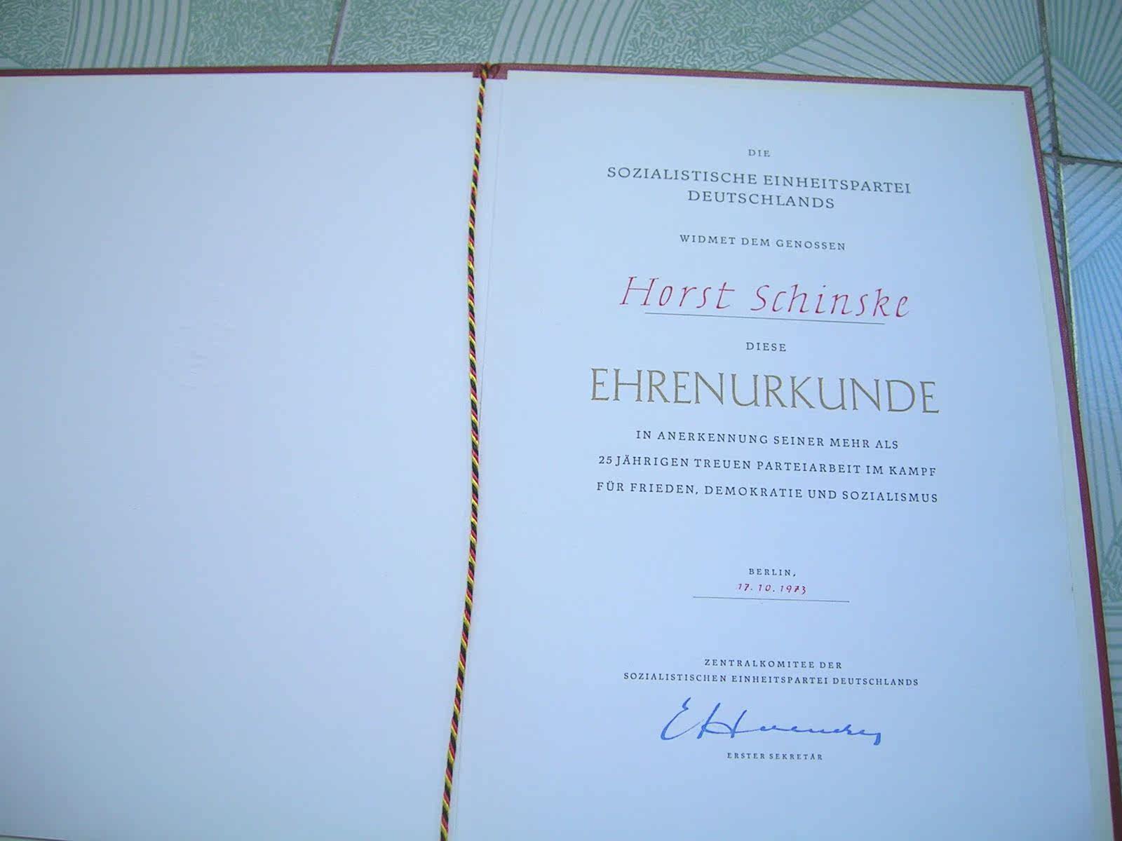 East German original: 25-year loyal party work certificate of the German United Socialist Party