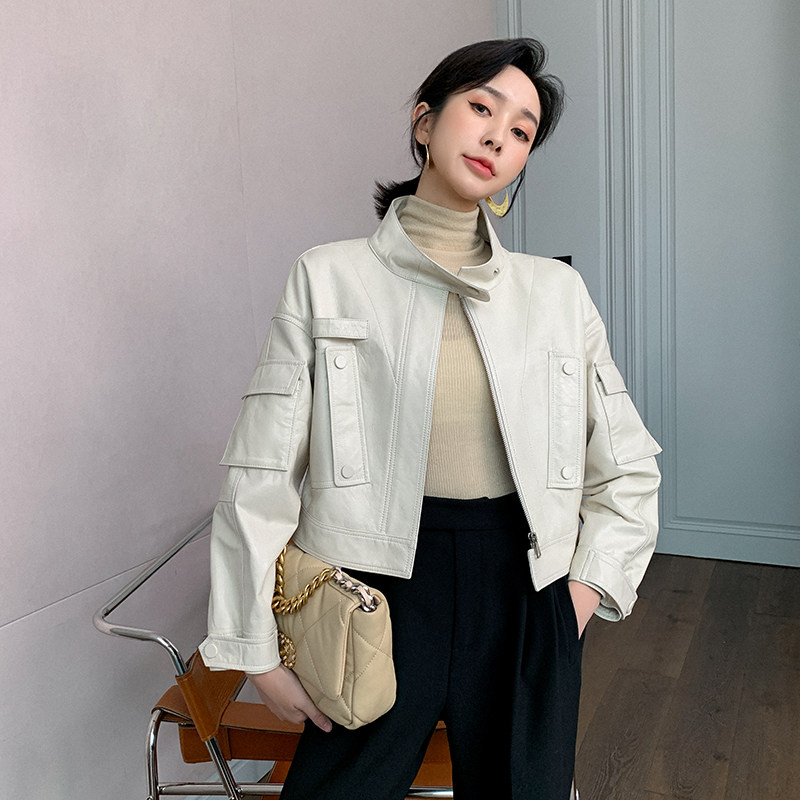 KC home 2022 new imported sheepskin leather jacket women's short stand collar loose jacket tooling small coat