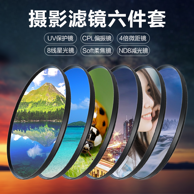 UV protection mirror -- anti-ash and mildew protection lens CPL polarising mirror -- eliminating reflective enhancement saturation 8 linear starlight mirror -- night view theorizer sparkling star-studded 4 times microlens -- micro-distance photography details