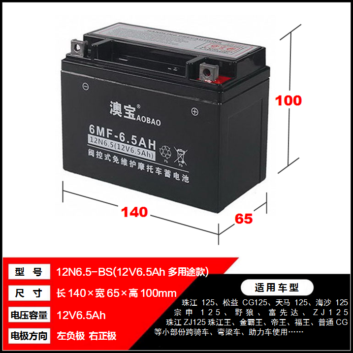 12N6 5-BS locomotive dry battery ZJ125 Zhujiang Zongmen CG125's CG125 5AH 5AH storage battery