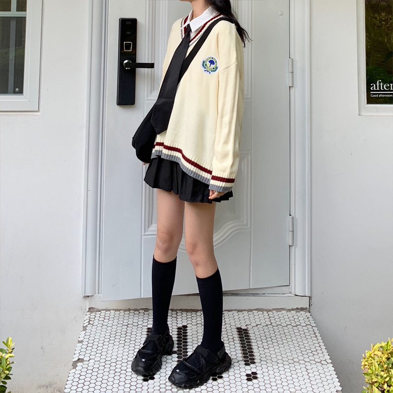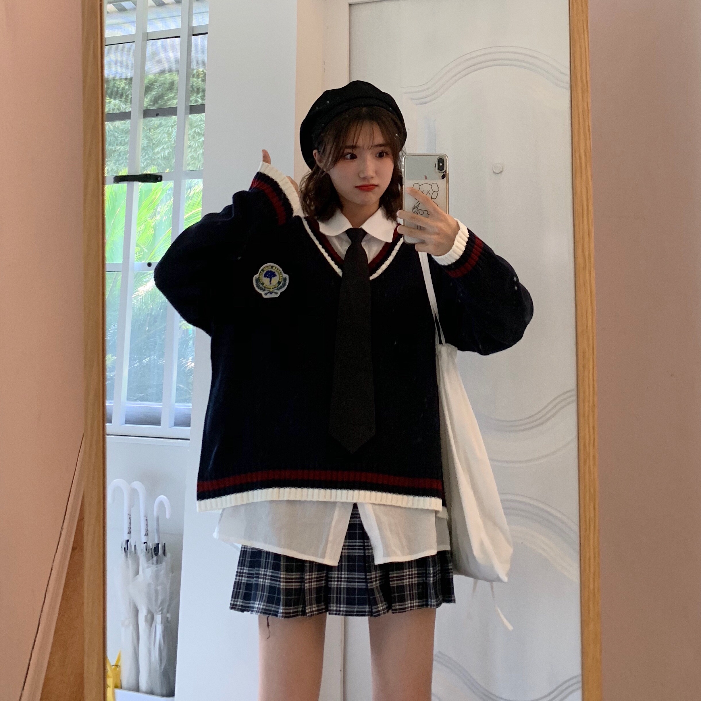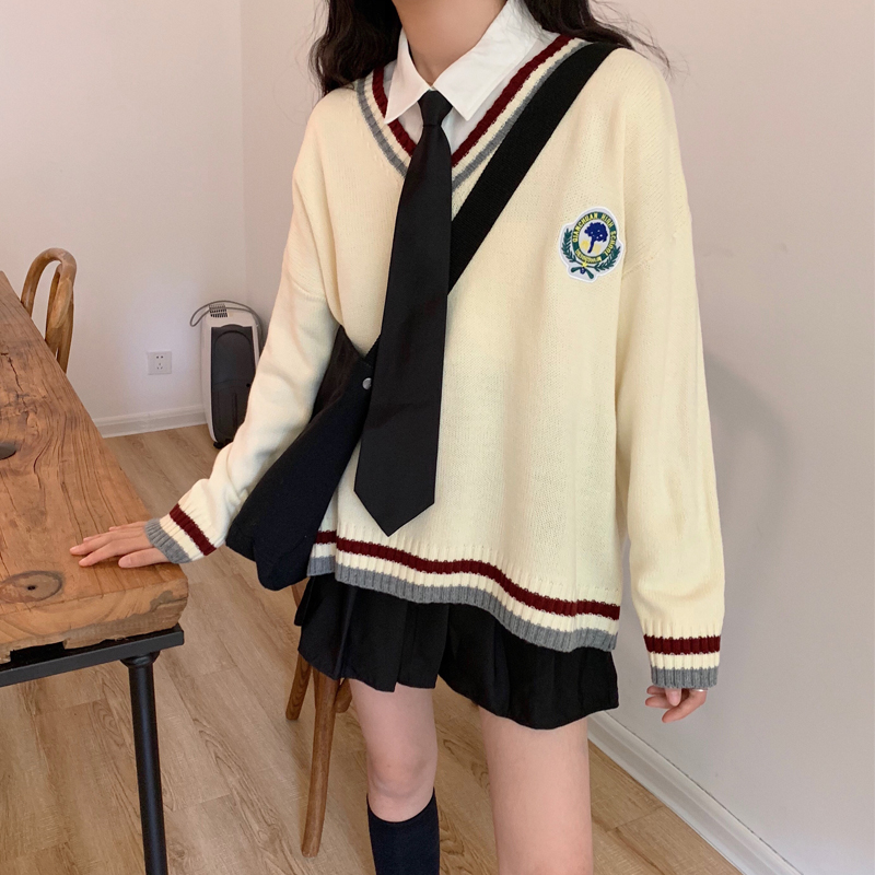Jk uniform sweater coat Japanese college style loose V-neck sweater autumn and winter suit pullover lazy wind woman
