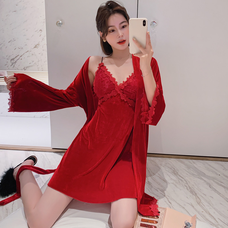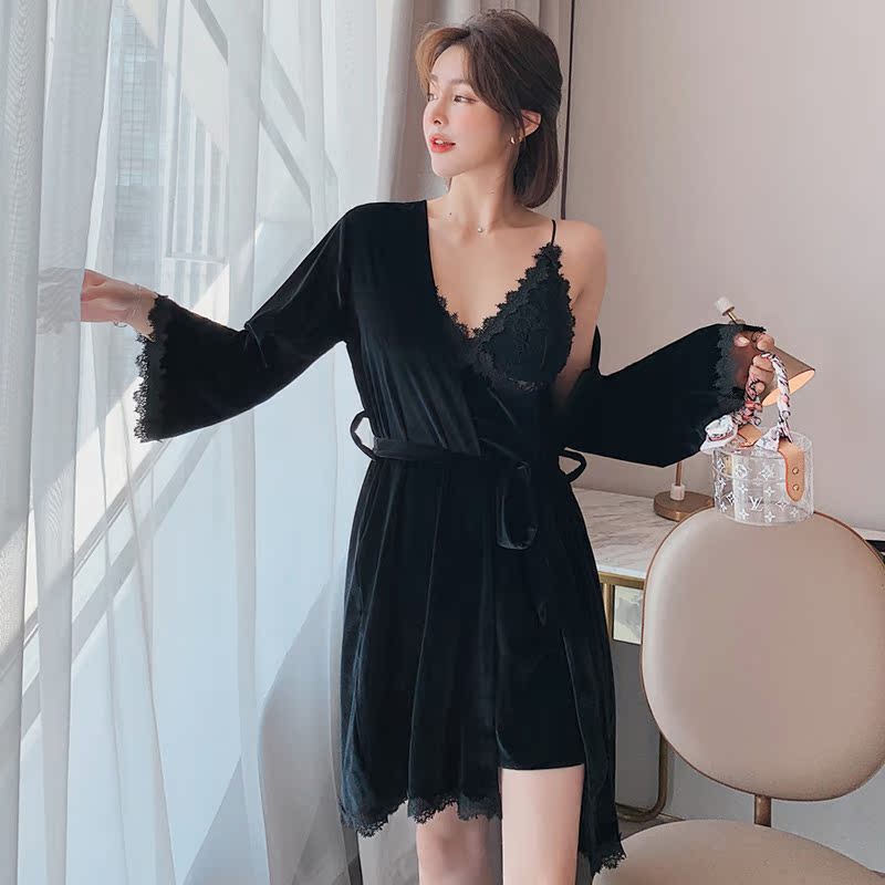 Gold velvet pyjamas women's autumn winter velvet sexy harnesses V collar Long sleeves Sleeping robes Two-style suits Home Suits Spring