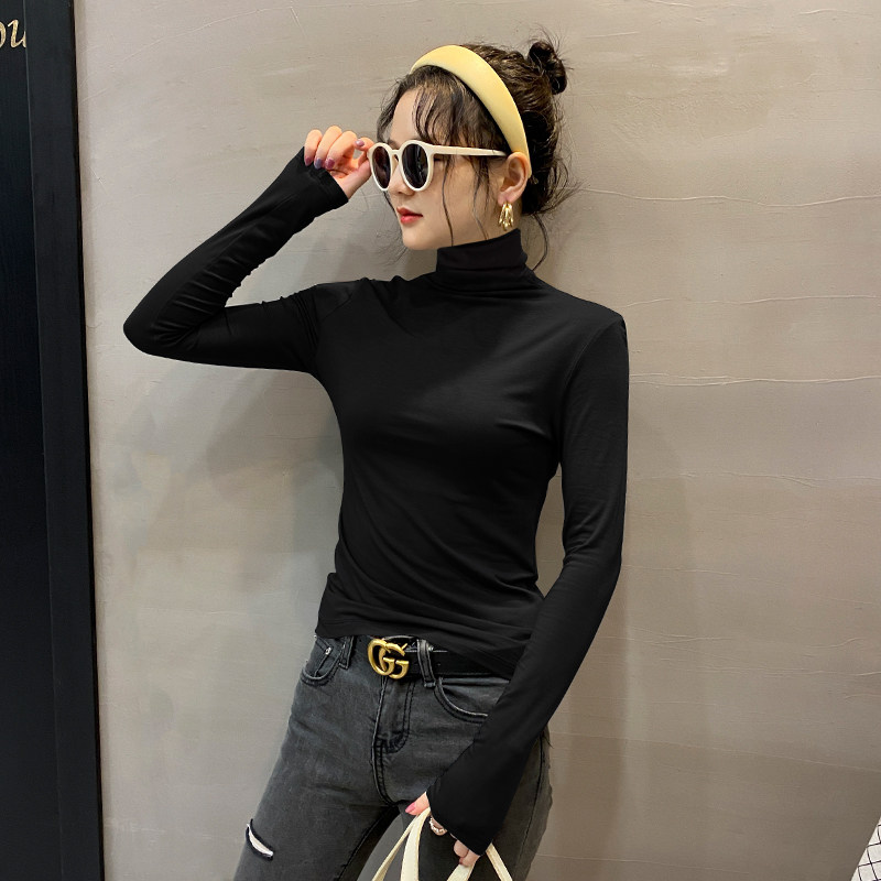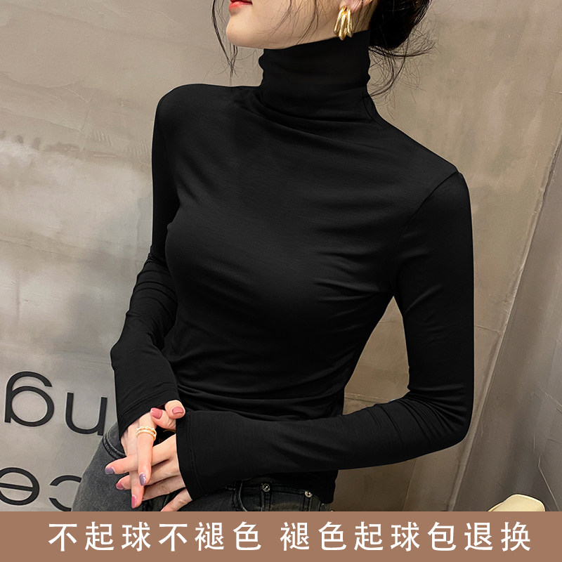 High collar double face Decede 2023 spring autumn and winter beating undershirt female inner lap long sleeves plus suede thick black foreign air warm blouses-Taobao