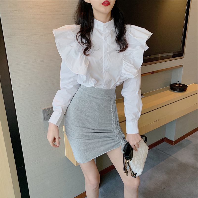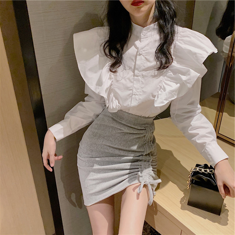 Stand-up collar ruffled single-breasted slim long-sleeved shirt + high-waist fleece skirt Western style two-piece fashion suits