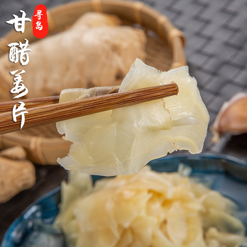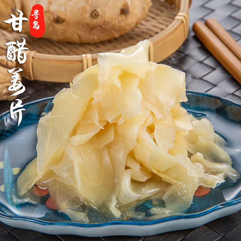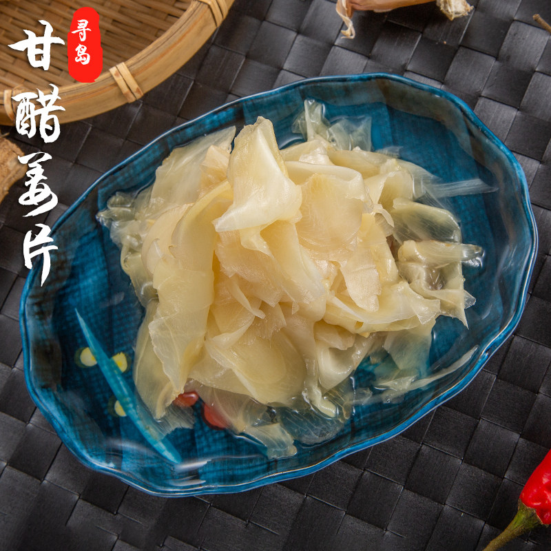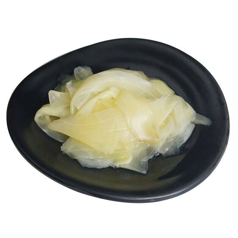Sushi with sweet vinegar and ginger slices, side dishes, ramen companion, kimchi pickles, sweet and sour Japanese appetizers