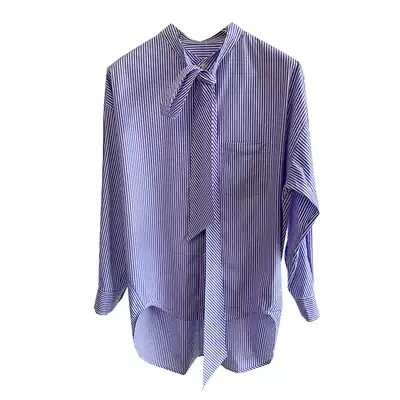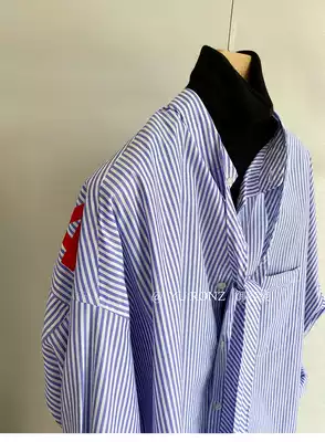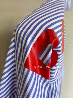 Very trendy, very fan, loose silhouette~blue and white stripes, pure cotton off-the-shoulder streamers, offset printing shirt, women's spring 9571