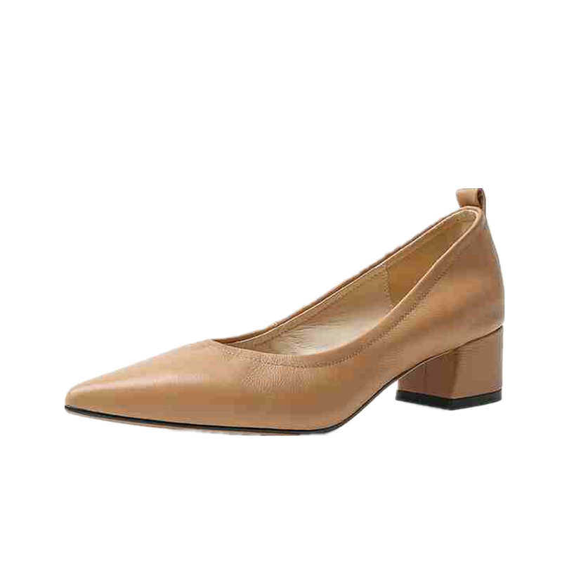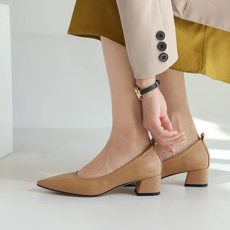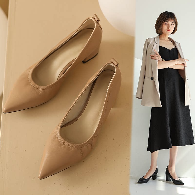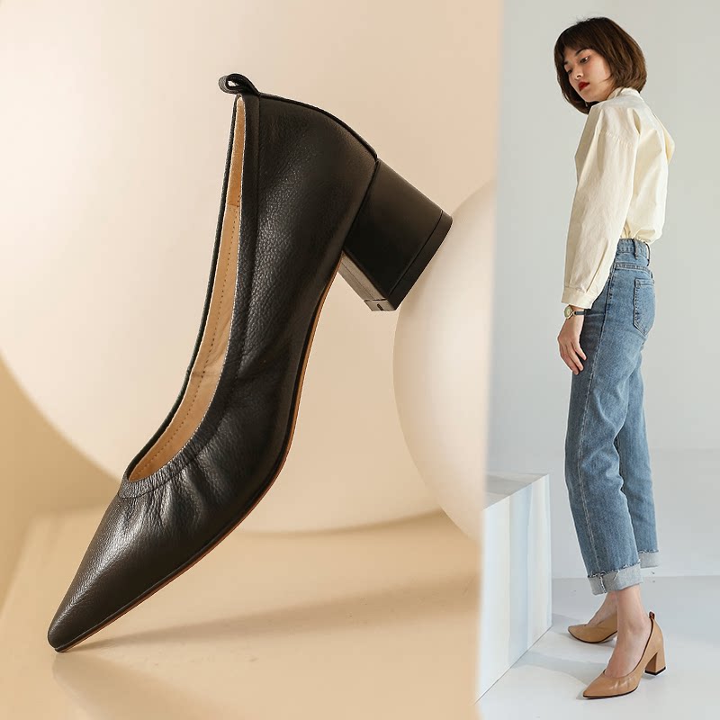 Givenivan soft leather pointed toe chunky heel granny shoes women's leather commuter style elasticated nude mid-heel bag shoes