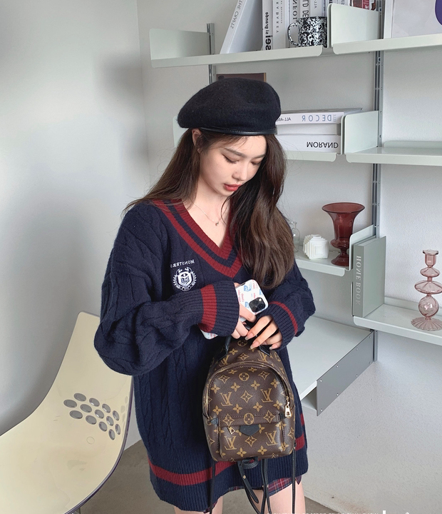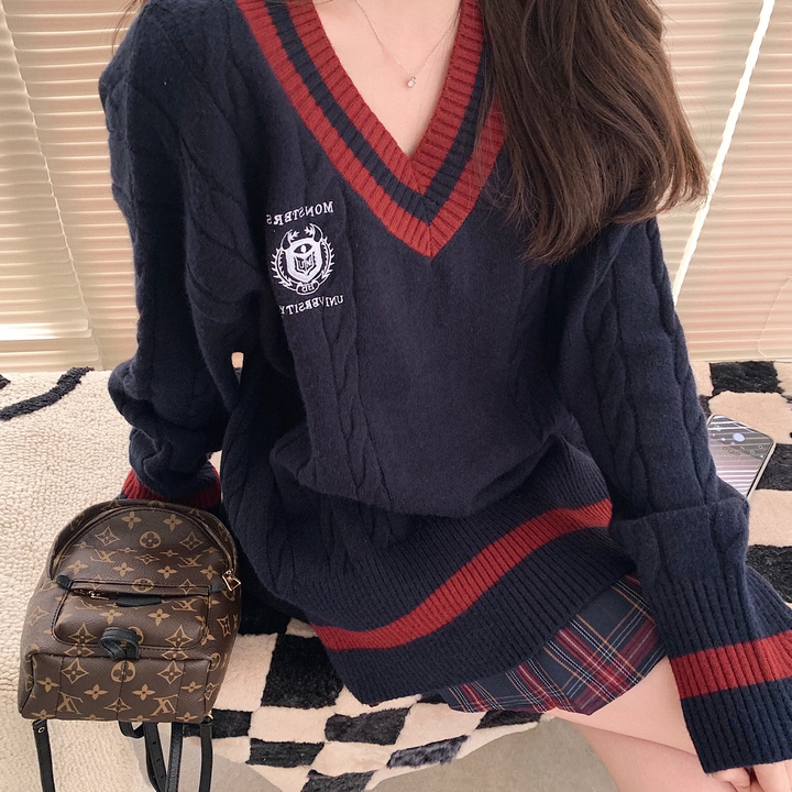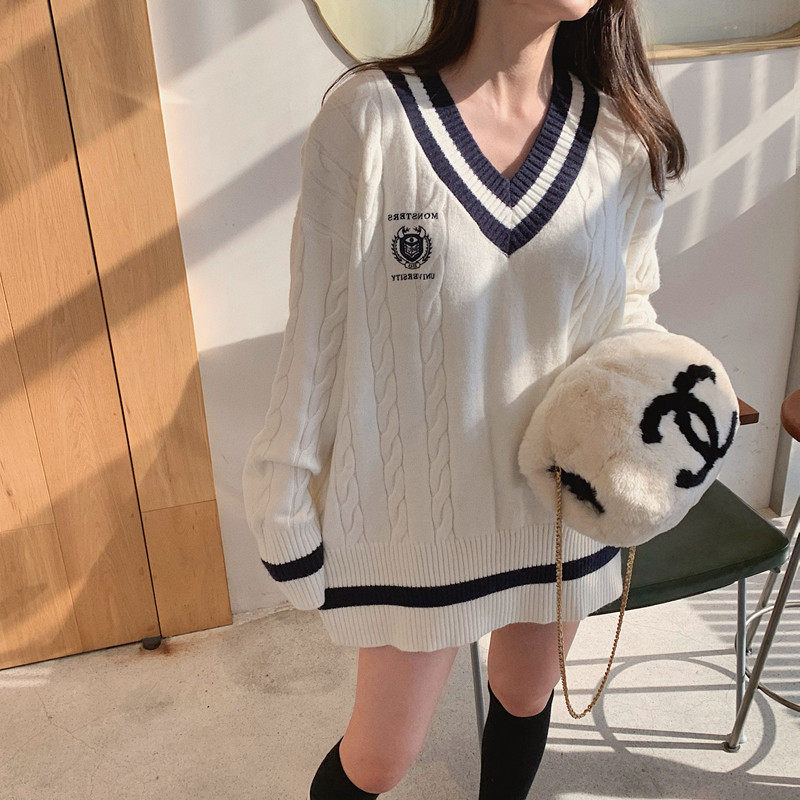 Korean version chic college style embroidery V-neck loose girl knitted sweater 2021 autumn mid-length sweater dress