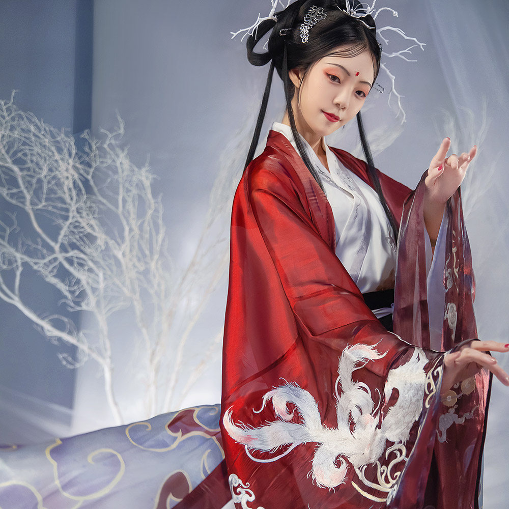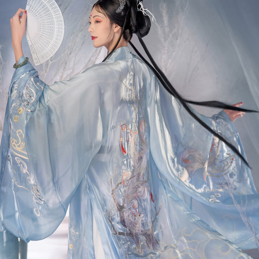 Original Design of Falling Flower Notes Hanfu (Lucky Fox) Printed Basket Sea Color Big Sleeve Shirt Embroidery