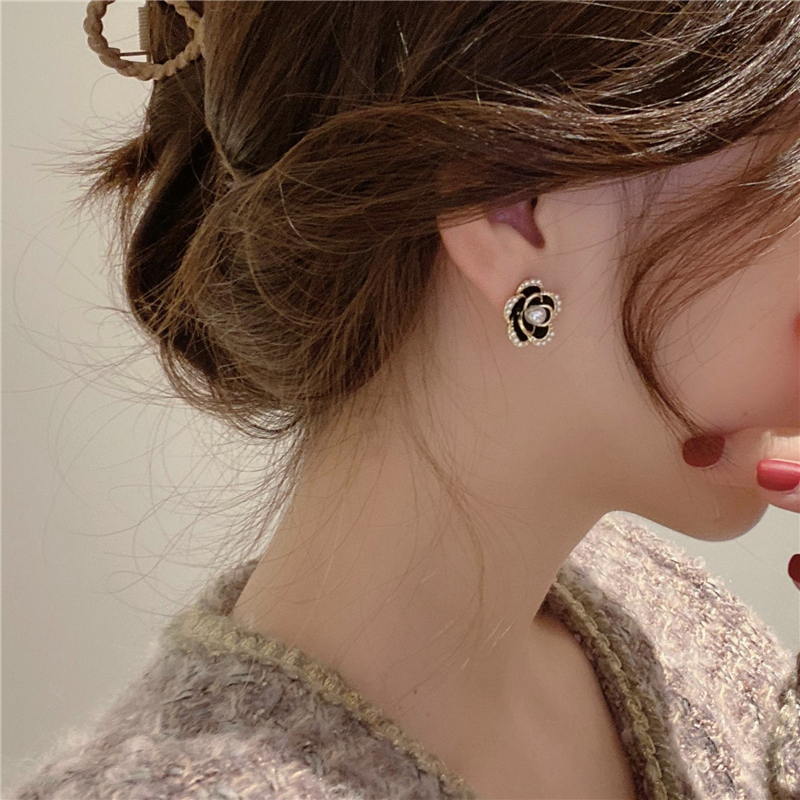 S925 silver needle French camellia earrings female Korean net red retro temperament ear needle high-end Hong Kong style earrings